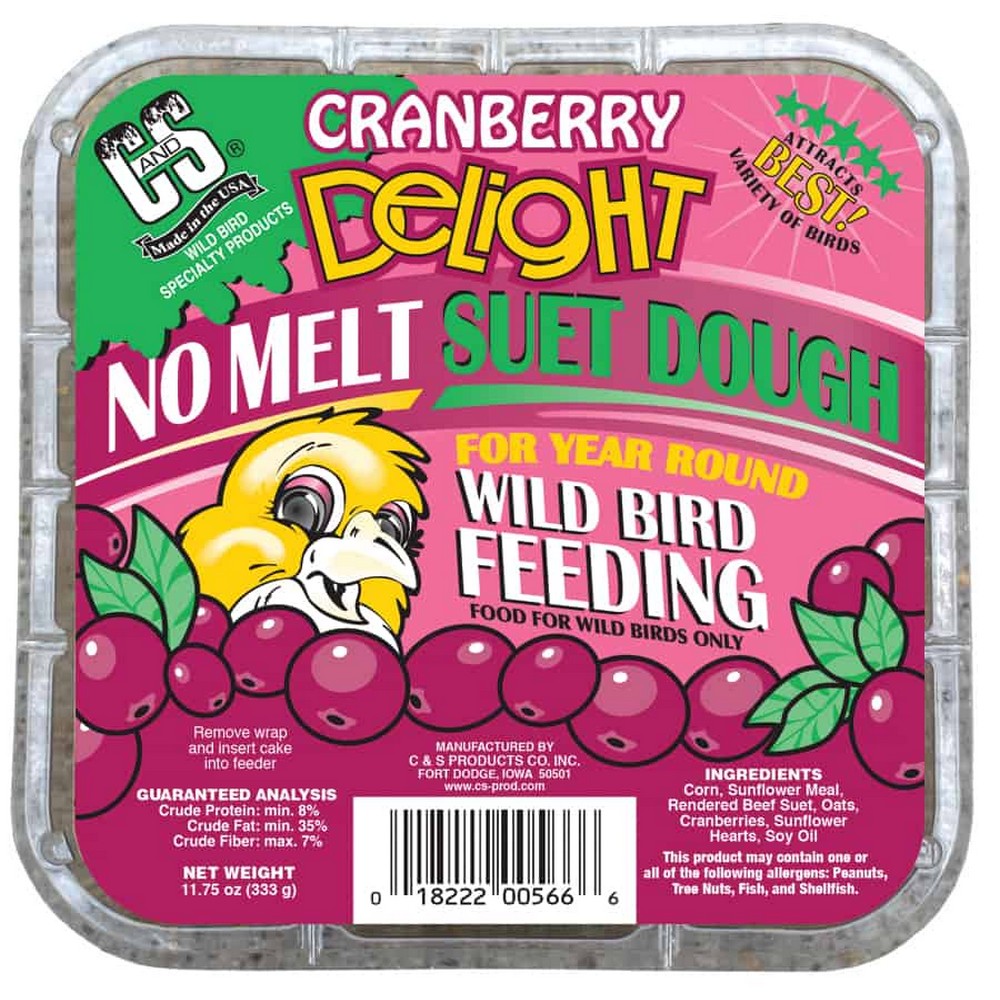 Corn, Sunflower Meal, Rendered Beef Suet, Oats, Cranberries, Sunflower Hearts, Soy Oil. No Melt, No Mess, Now Waste. Sunflower meal base and high fat content for extra energy. A product unmatched in the industry for year round feeding in all types of weather. FANTASTIC wild bird acceptance. (must order in 8's)