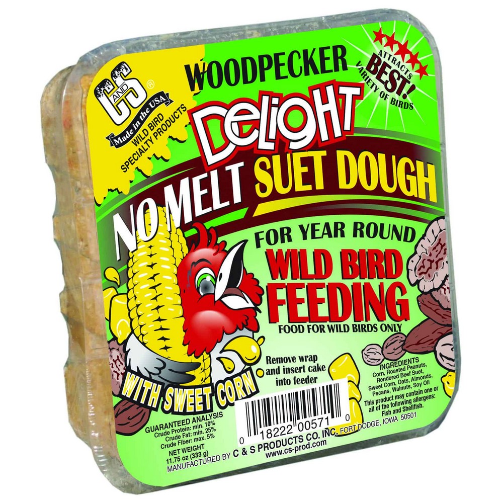 Corn, Roasted Peanuts, Rendered Beef Suet, Sweet Corn, Oats, Soy Oil, Almonds, Brazil Nuts, Cashews, Pecans, Walnuts. Delights are mixed into a soft dough texture which is pressed into cake form. C&S's process creates the only true NO MELT suet product line. For YEAR ROUND Wild Bird Feeding. (must order in 8's)