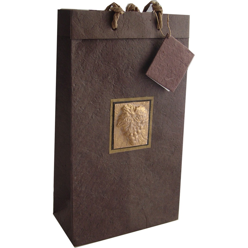 A Bella Vita Best Seller! Our chocolate brown handmade double bottle wine bag is elegantly embossed with a Tuscany grape cluster design that is a crowd favorite. Hand painted, these totes are eco friendly, sustainable, reusable, and features a compartment separator that folds out to protect each bottle. It's easy to see why these gift bags fly off the shelves!