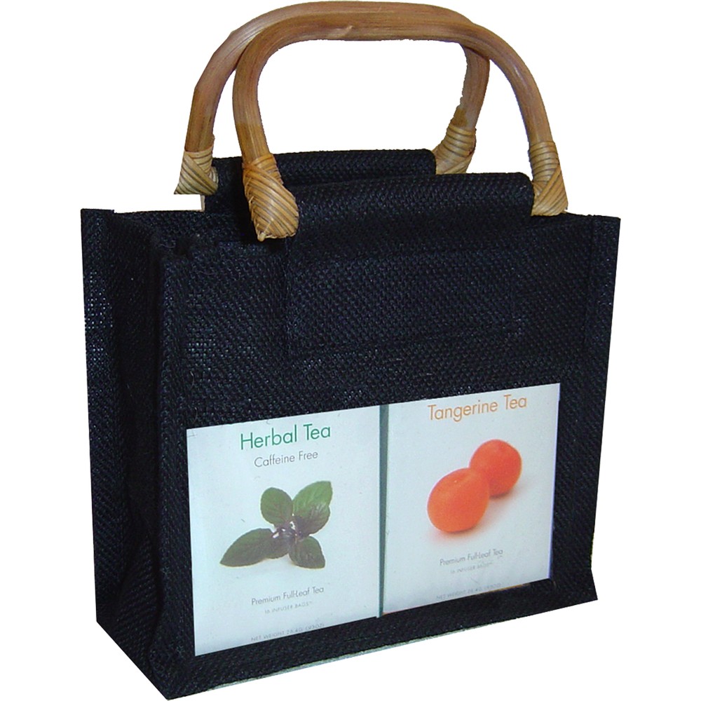 An essential for decorative food packaging, Bella Vita's double compartment Black gourmet bag is sustainable, eco friendly, and reusable. This gift bag features a compartment separator and item windows so you can safely display your gourmet treats. Crafted with a Jute body and Bamboo handle, this packaging is perfect for jams, salsas, or any of your gourmet gift ideas.