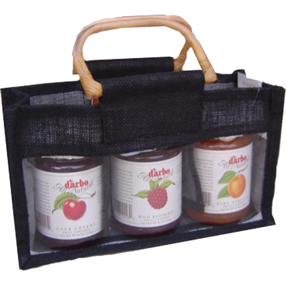 An essential for decorative food packaging, Bella Vita's triple compartment Black gourmet bag is sustainable, eco friendly, and reusable. This gift bag features a compartment separator and item windows so you can safely display your gourmet treats. Crafted with a Jute body and Bamboo handle, this packaging is perfect for jams, honey, or any other gourmet gift ideas you can dream up.
