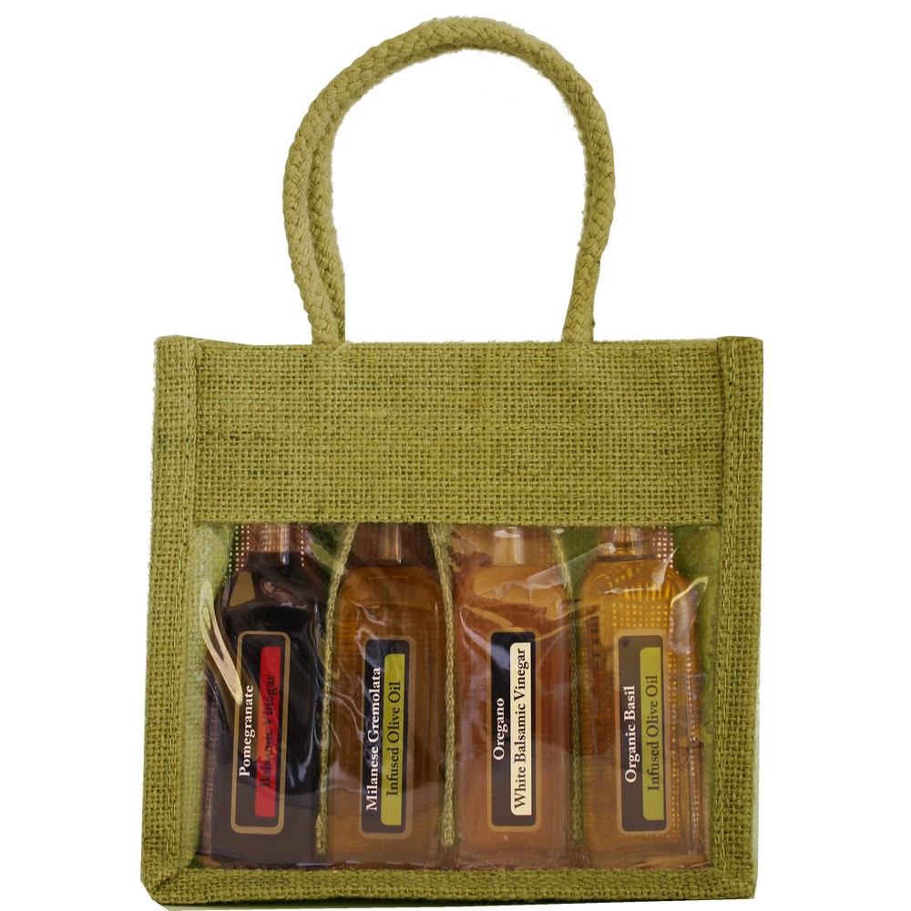 Bella Vita's OJ4 Sampler bags are designed to hold 4 sample size (typically 60mL) olive oil or vinegar bottles. This sophisticated Black jute bag features a clear window to show off the bottles, and dividers for protecting each one. A great way to create ready made gift sets for your customers.