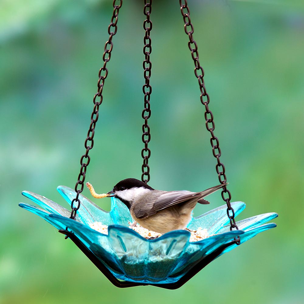 Flared Petal Design provides multiple perches for birds and longer viewing enjoyment. Detached Glass Bowl supports quick and easy hand-cleaning. Recycled Glass & Powder coated Metal Construction makes for an eco friendly and longer lasting feeder
