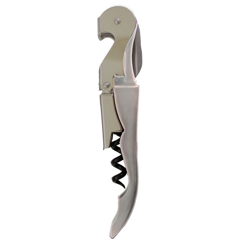 DescriptionReviews Description premium silver metal double lever bottle opener makes for easy opening. The sleek design is compact and features an innovative built in serrated foil cutter, corkscrew, and bottle cap opener. Reviews Be the first to review this item There are no reviews yet