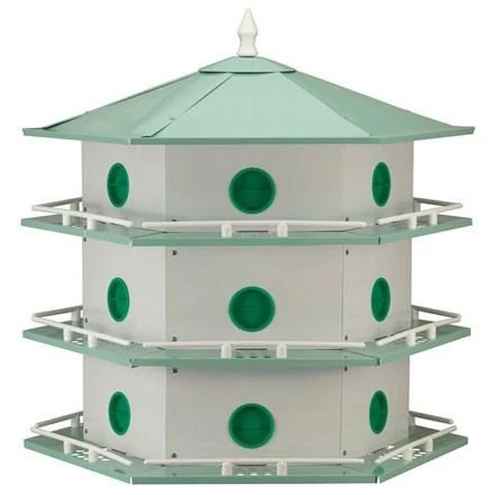 Purple Martins are social birds that prefer colony living. Heath’s 18-room Deluxe Purple Martin House is designed in a hexagon shape and built for the birds. Because it’s constructed of durable, lightweight aluminum it's made to keep the birds cooler in the summer months. Each room includes door stops and protective rails. Mounting pole sold separately.