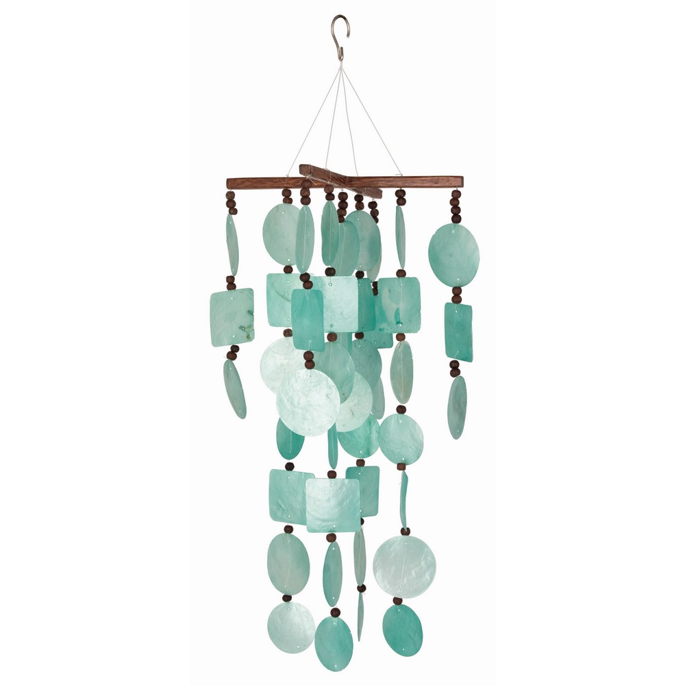 The dark brown wood contracts with the cool blue/green shells. Wood top, 2 in aqua capiz shells (20 round, 13 square), wood bead accents. Length: 22 in. Capiz shells come from pearl oysters, commonly known as kapis. These shellfish are farmed in Indonesia and every bit of the oyster is used. The shells are carefully sorted, dried, sliced, shaped, sanded and dyed. Strung together with strong, invisible, nylon cord, the thin, flat translucent shells provide luminous color. And, when touched by the wind, these chimes produce a delicate tinkling musical sound. In the 1500s, these shells were used as windowpanes in houses; now they are used in all sorts of home decorations, including lamp shades, vases and, of course, windchimes!