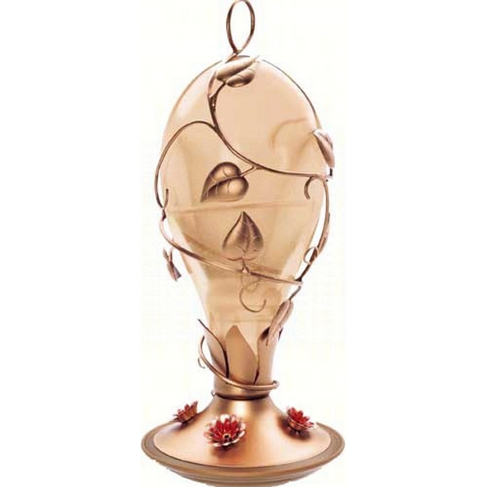 Looking Glass Hummingbird Feeder. Durable tempered tinted glass nectar container. 32 oz. capacity. Copper base cover with four bee-resistant flower feeding stations. Integrated perch invites hummingbirds to sit and dine. Bilingual French/English packaging