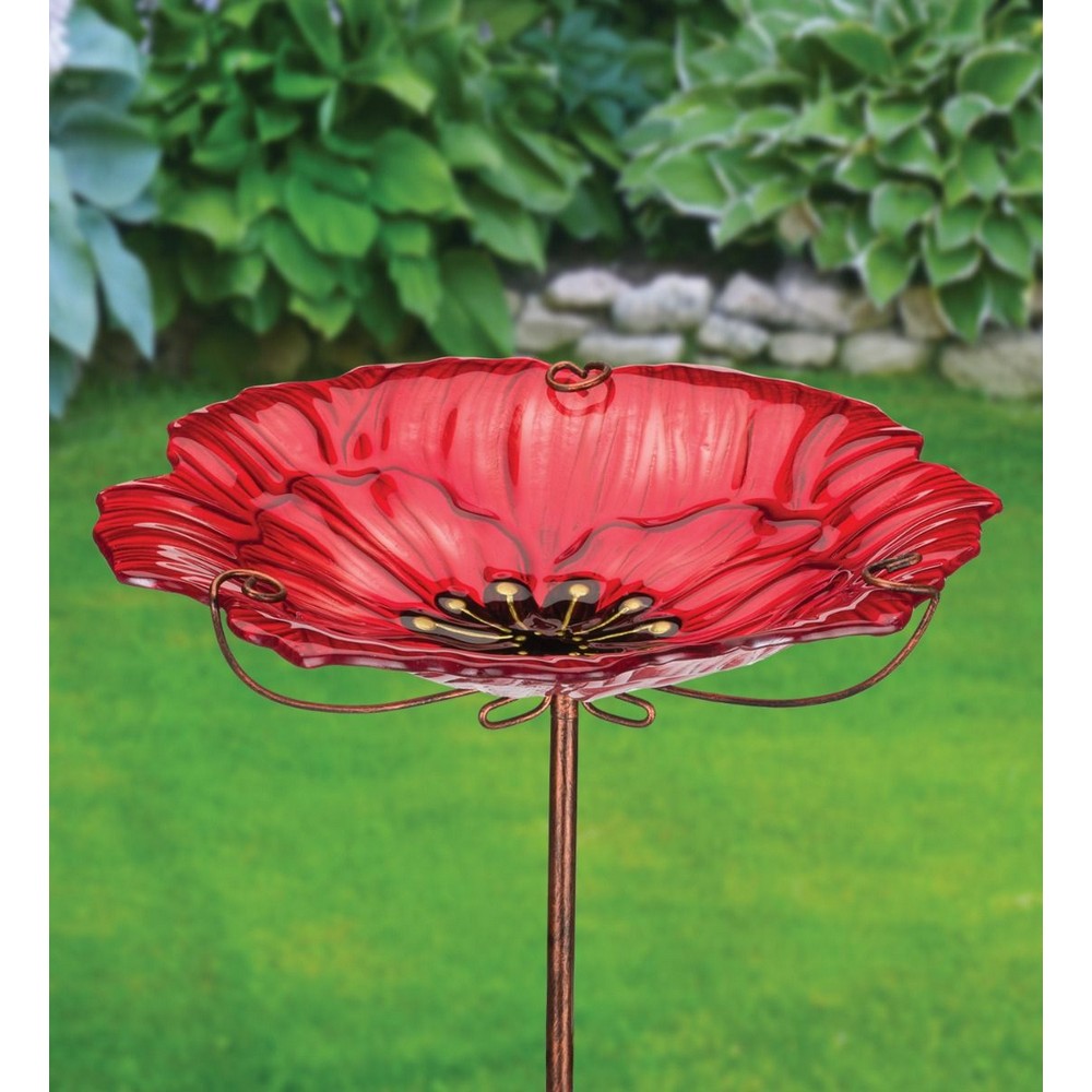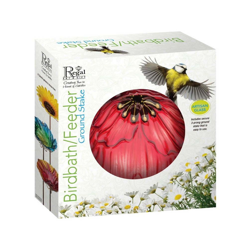 This beautifully crafted art glass bowl bird bath/feeder stake stands proud with a stable 3-pronged base providing the perfect area for feathered friends to visit! Offering the choice to be used as a bird bath or bird feeder. The window color box allows customers to touch and feel the art glass. Available in six styles: Sunflower, Poppy, Yellow, Red, Purple and Blue.