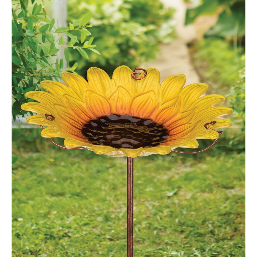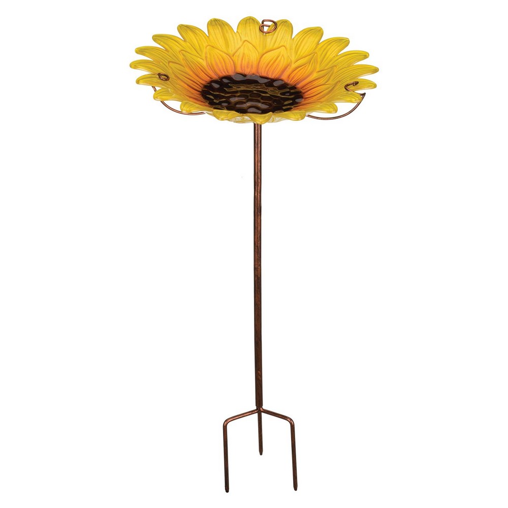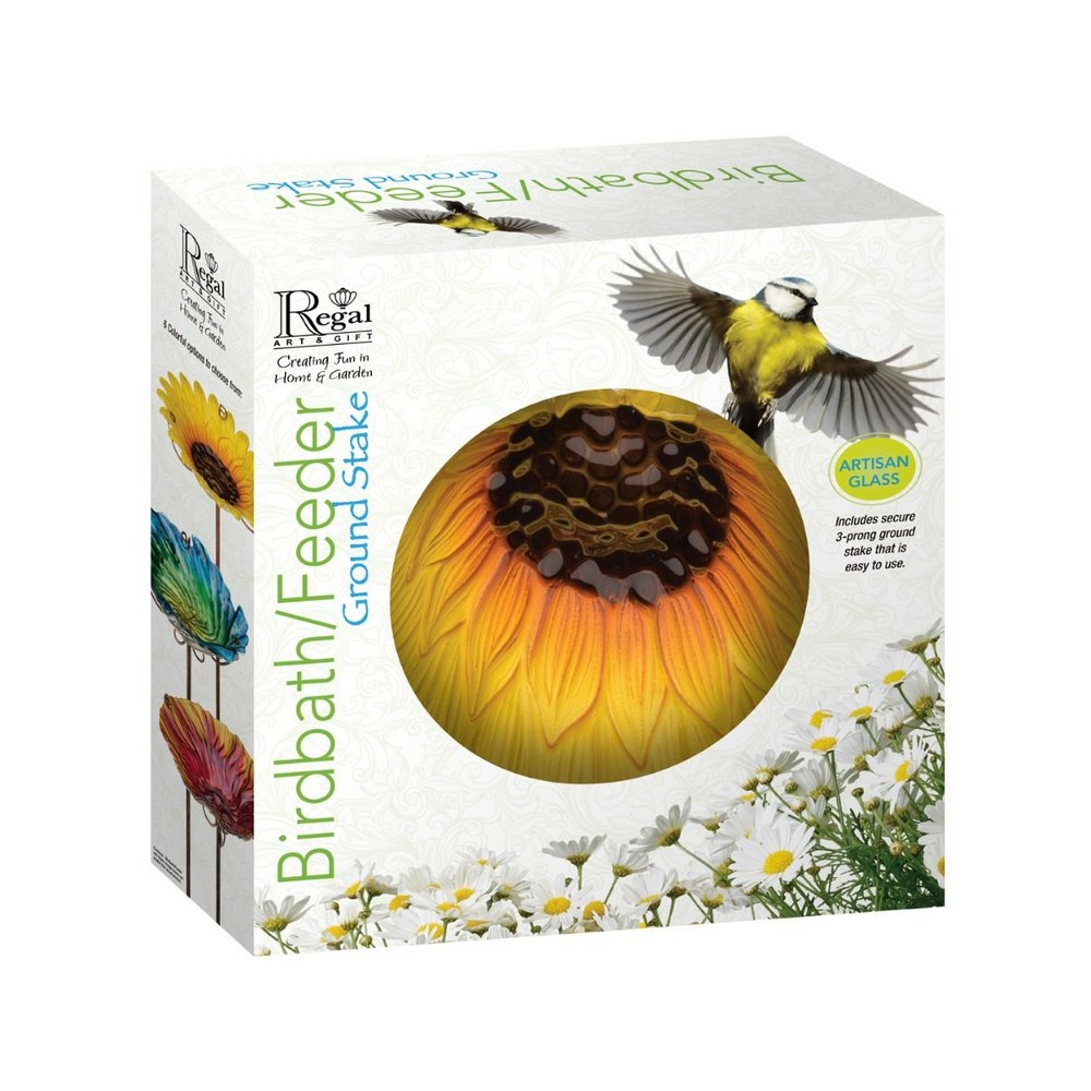 This beautifully crafted art glass bowl bird bath/feeder stake stands proud with a stable 3-pronged base providing the perfect area for feathered friends to visit! Offering the choice to be used as a bird bath or bird feeder. The window color box allows customers to touch and feel the art glass. Available in six styles: Sunflower, Poppy, Yellow, Red, Purple and Blue.
