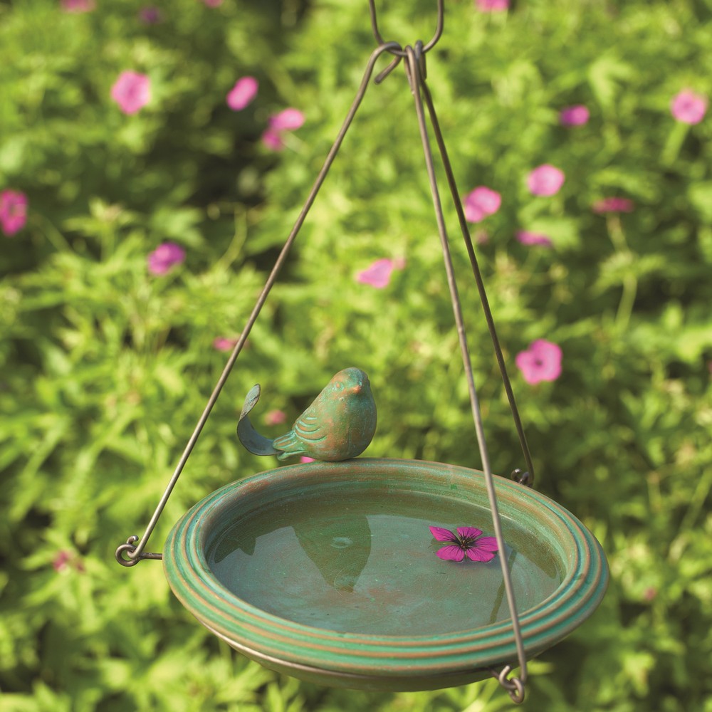 DescriptionReviews Description Teal colored, round, hanging ceramic birdbath decorated with matching metal-tailed bird. Sturdy metal hanger that can be hung from a tree or shepherd's hook. Reviews Be the first to review this item There are no reviews yet