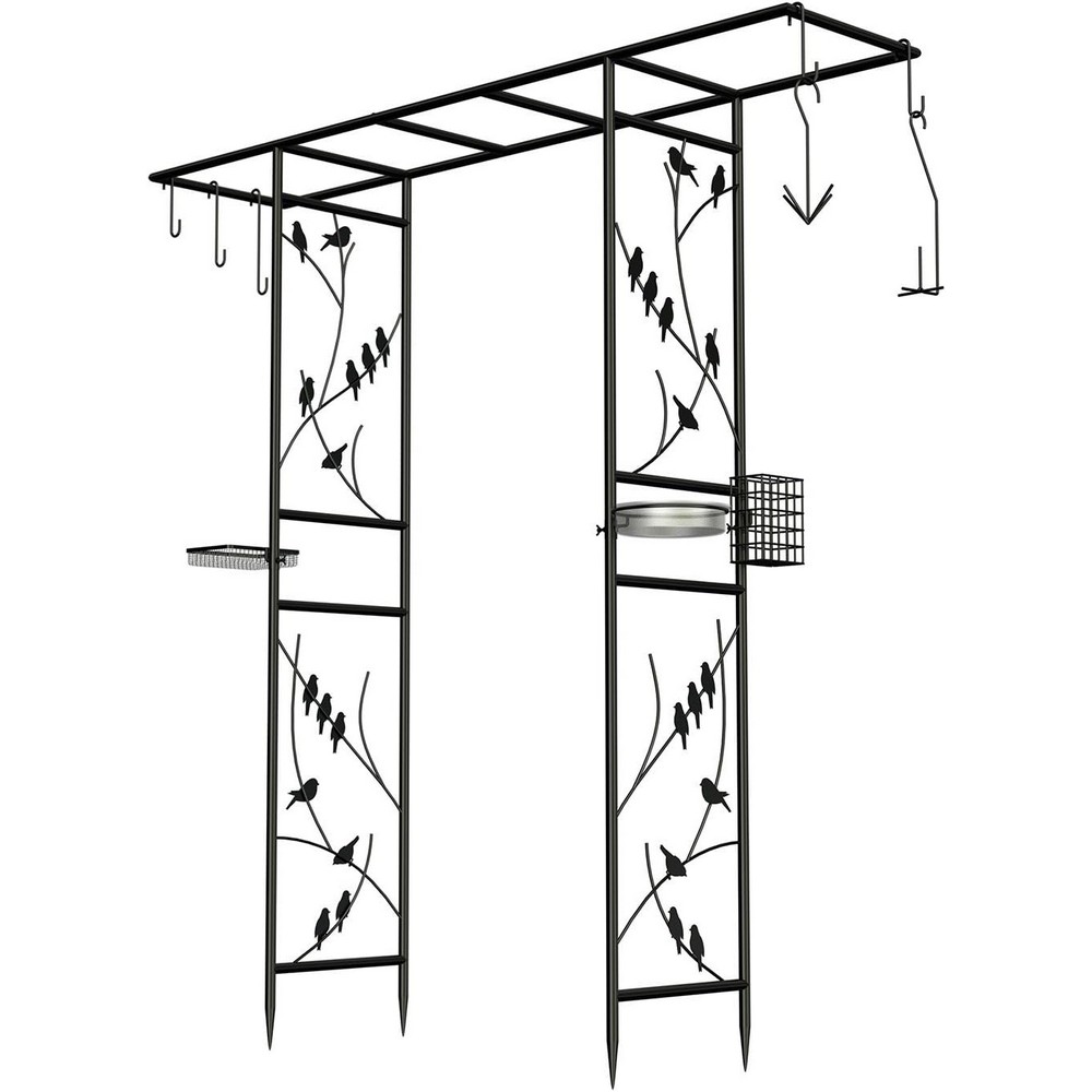 The 10-piece garden arbor and bird feeding station is an attractive addition to your backyard. It includes 1-84 inch arbor with bird motif trellis sides; 4-S hooks (sizes 6 inch, 8 inch, 10 inch, 12 inch); 1-fruit stake feeder hook; 1-seed cylinder/corn cobb feeder hook; 1-acrylic bird bath; 1-mealworm feeder; and 1-suet feeder. This item requires additional freight when shipping to a Brick and Mortar location.