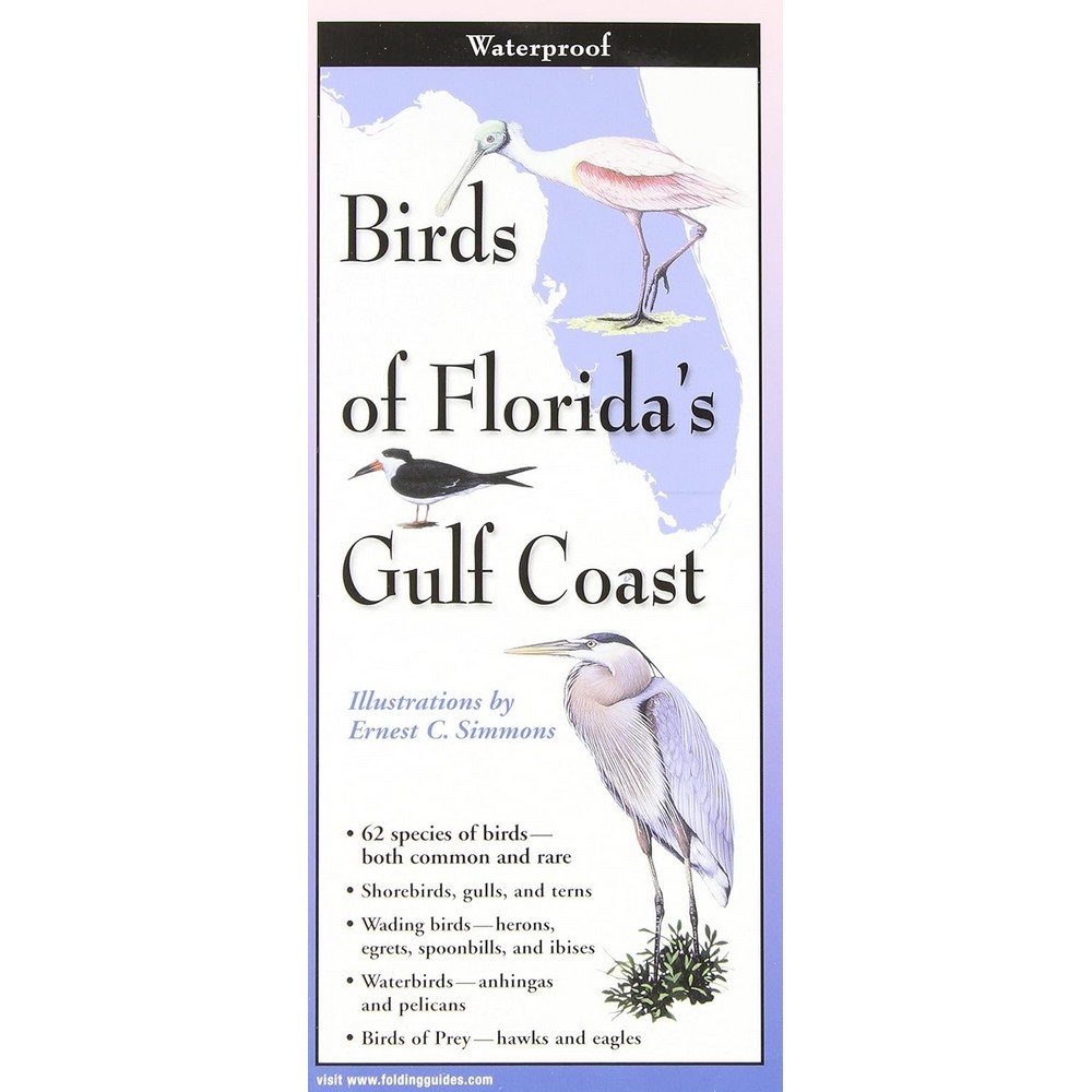 Folding Guides offer instant access to just what you need to know. Indestructible lamination water and beach proof. 62 bird species, both common and exotic, commonly seen in Florida Gulf Coast, from the Alabama border all the way down to the Everglades City. Includes shorebirds, wading birds, beach species, gulls and terns, ducks, and birds of prey. Species selection and captions by local experts. Illustrations by Ernest C. Simmons.