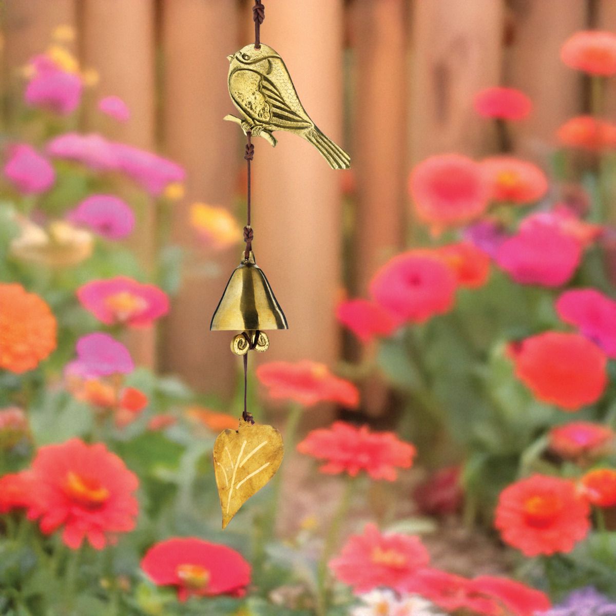 A solid Brass chickadee perches above one of our hand cast Himalayan bells. A bodhi leaf windcatcher dangles below, a traditional symbol of the infinite wisdom of Buddha nature. This unique and lovely chime makes a wonderful accent to the garden and porch areas. Made exclusively for dZi by the Tibetan colony of Lingtsang in northern India, these handsome Tibetan bells and chimes are individually sand-cast in solid Brass and carefully hand-tuned to ensure clarity of sound and tone.