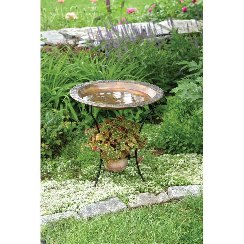 A stylish addition for a patio or garden, our Copperplated Iron Birdbath features a handsome scrolled flowering vine embossed rim and sturdy, yet graceful, iron legs fashioned to hold a potted plant. A perfect companion piece to our Copper Dripper/Fountain. The birdbath stand is 22 inches in height, the basin is 22 inches in diameter and the basin is 2 inches deep. The kit contains the stand, the basin and the hardware. It is designed to hold a 7 inch potted plant of approximately 5 pounds max in weight.