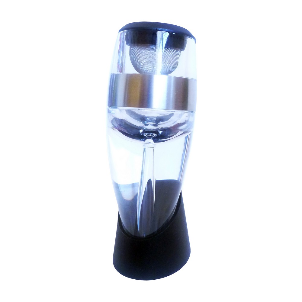 Enhance the flavor of your wine with this state of the art patent pending aerator. Featuring a 360 degree multi stage aeration system, the aerator disassembles for easy cleaning, and slips into your wine bottle with ease. The set includes the deluxe aerator, a stand, and a velvet pouch for travel.