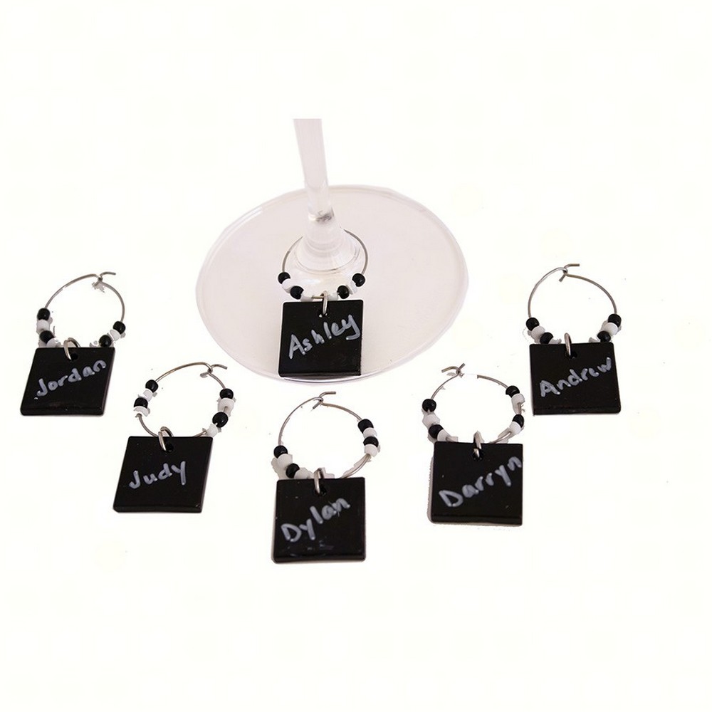 DescriptionReviews Description Keep track of your stemware with this set of six decorative glass wine charms. Wine charms are a fun hostess gift and great for entertaining. DIY Black Art charms come with a marker so you can personalize each charm, each on a beaded ring. Reviews Be the first to review this item There are no reviews yet Product tags Wine 3591