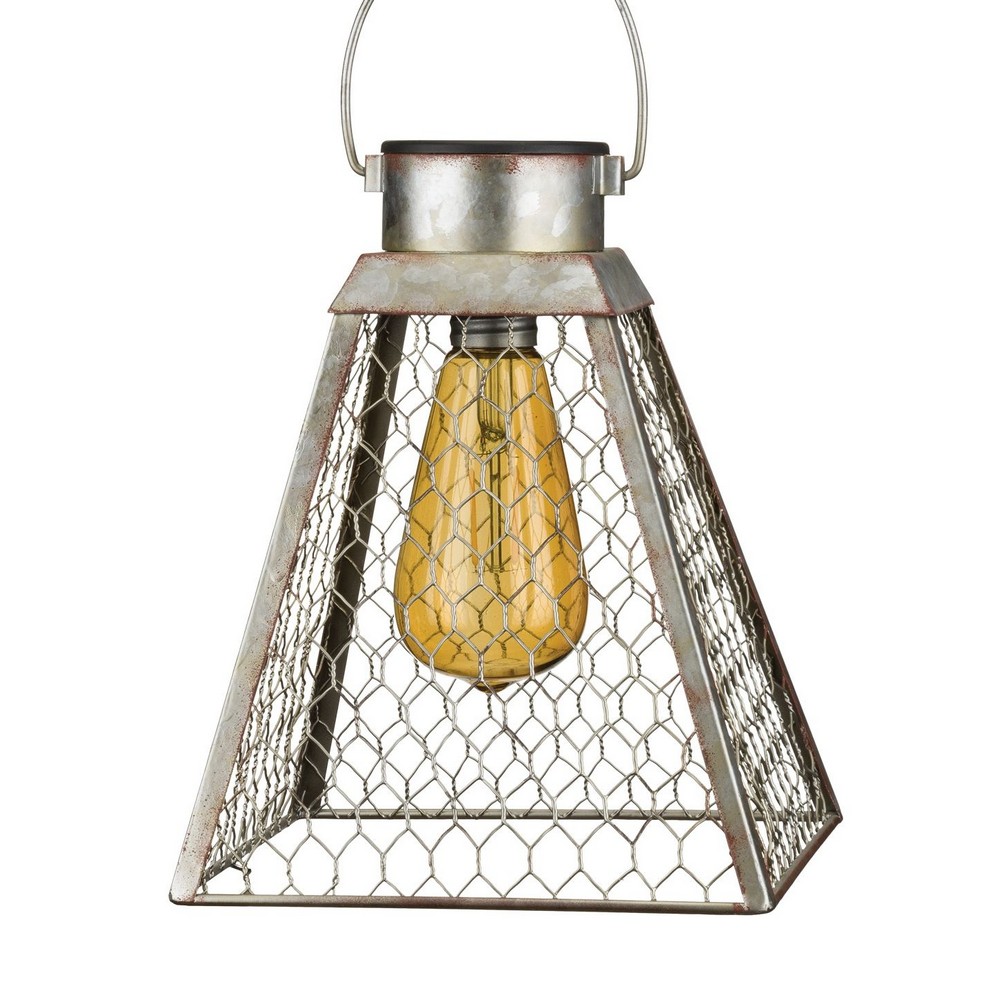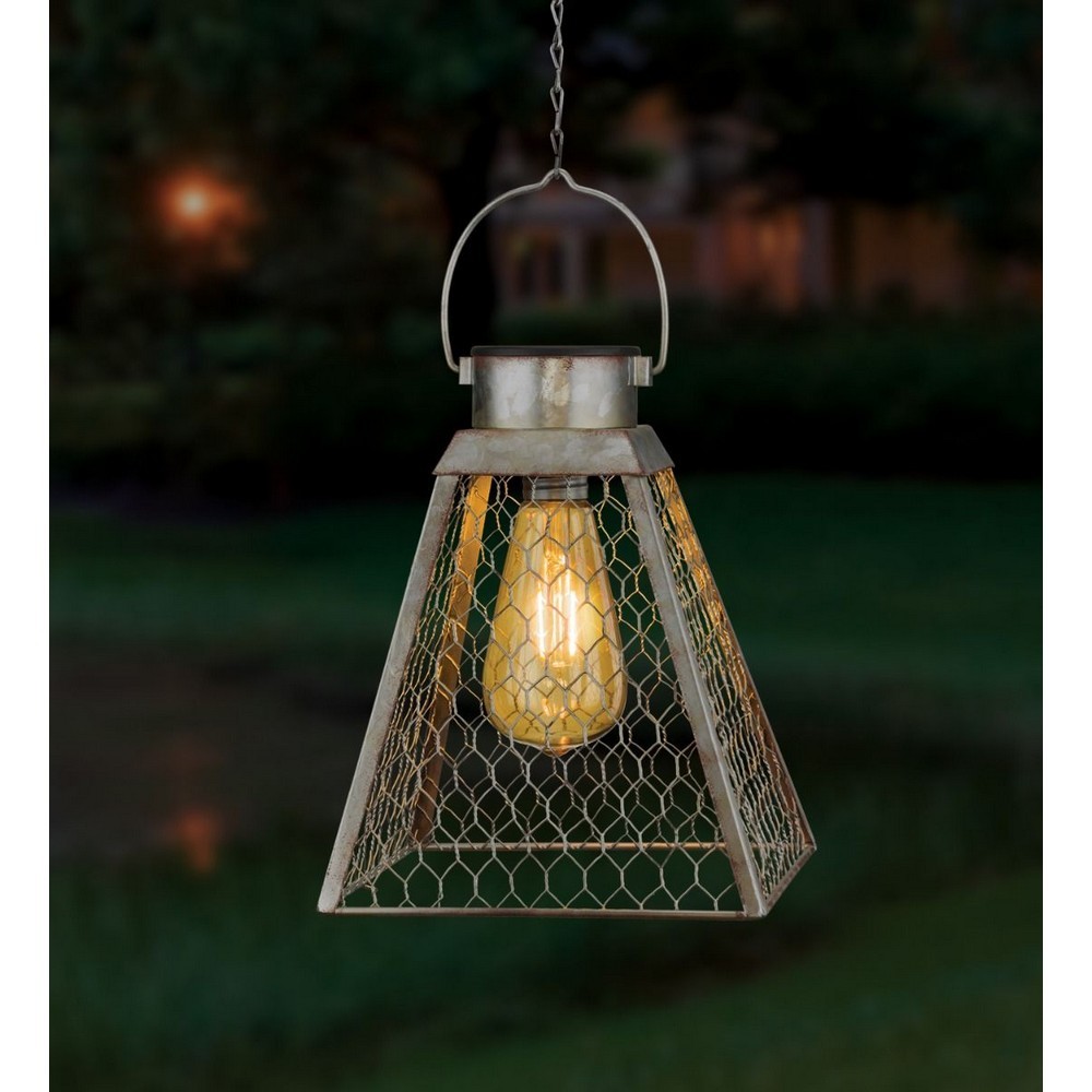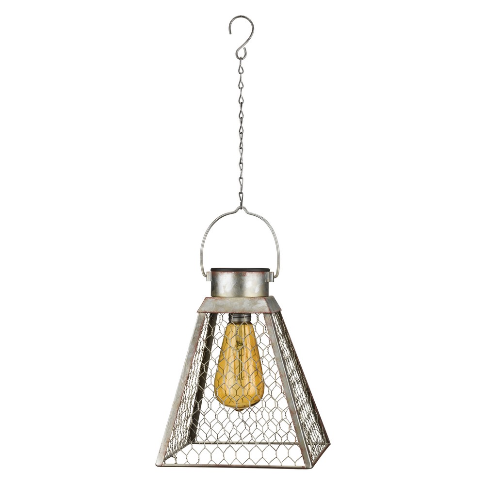 This lantern combines the rustic look of galvanized metal and a large Edison bulb in gold tinted acrylic resulting in a soft warm light that will enhance any outdoor space Lantern comes with a 9 inch chain and large hook for easy hanging. Measures 7.25 inches in diameter.