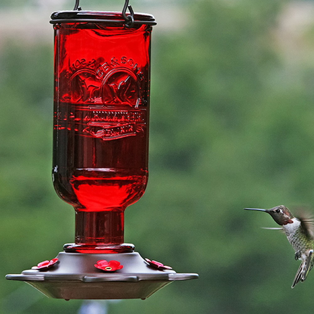 DescriptionReviews Description Decorative red antique bottle and pewter finish. Stands flat on counter for easy filling. 5 highly durable metal perches and beautiful red flowers are integrated into the basin. Holds 13 oz of nectar. Reviews Be the first to review this item There are no reviews yet Skip list Product tags Hummingbird 1214 Red 705