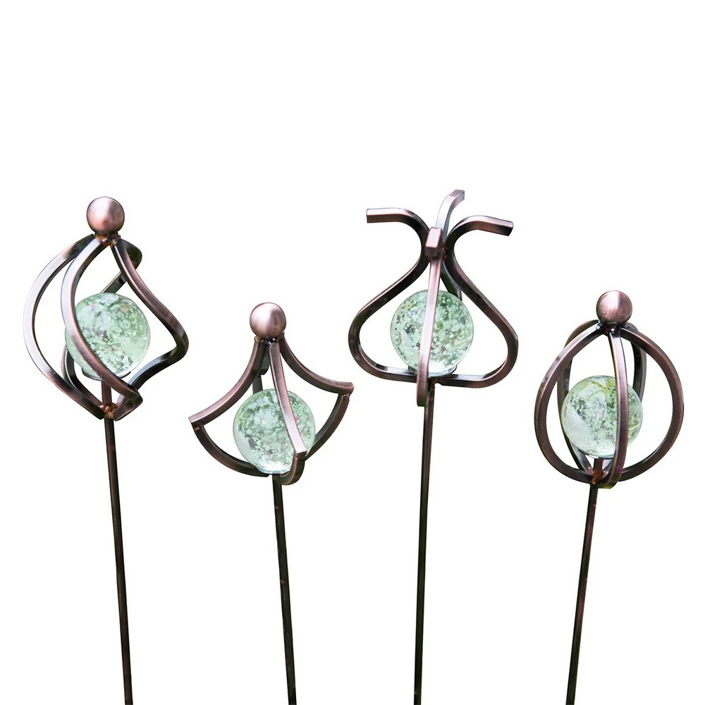 What better way to add elegance and charm to a container plant, hanging basket or window box planter than the stylish 3D looks of the Finial Pot Sticker Assortment. Each of the four models in the collection is individually formed by hand, giving each piece its unique character. Luminescent crystals inside the 1.5 in. glass marble absorb light energy during the day and emit it at dusk in the form of a soft green glow that gradually fades. The electroplate antique copper finish applied provides durability and protection from the elements.