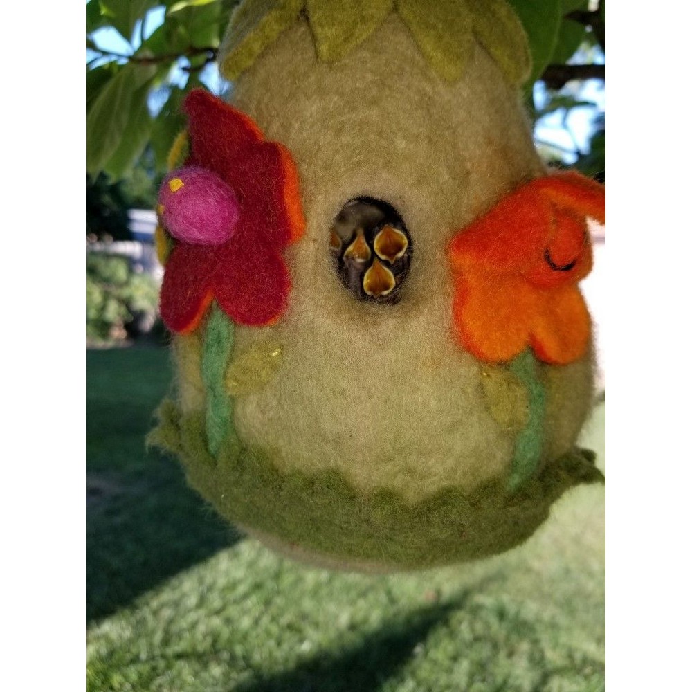Yes! It can be hung outside as well as inside, and yes, small birds like wren, chickadees, nuthatches and titmice will go inside! Made of 100% naturally water repellant wool, so when it does get wet on the surface it dries out fairly quickly. Wool is also naturally dirt and mold resistant. Birds might pull at the wool to use in making their own nests. Hang one up and see what happens! Colors will fade in direct sun after a few months, but the body will keep its shape in even the hardest weather. Will last forever in a protected place such as a porch or inside where its highly decorative qualities are sure to bring a smile to everyone. Use it as a door greeter, a porch ornament, or even to enliven a kitchen, bath or bedroom! Made with other sustainably harvested materials including a hemp hanging cord and bamboo perch. Handmade by skilled artisans working in a fair trade production center in Kathmandu, Nepal.
