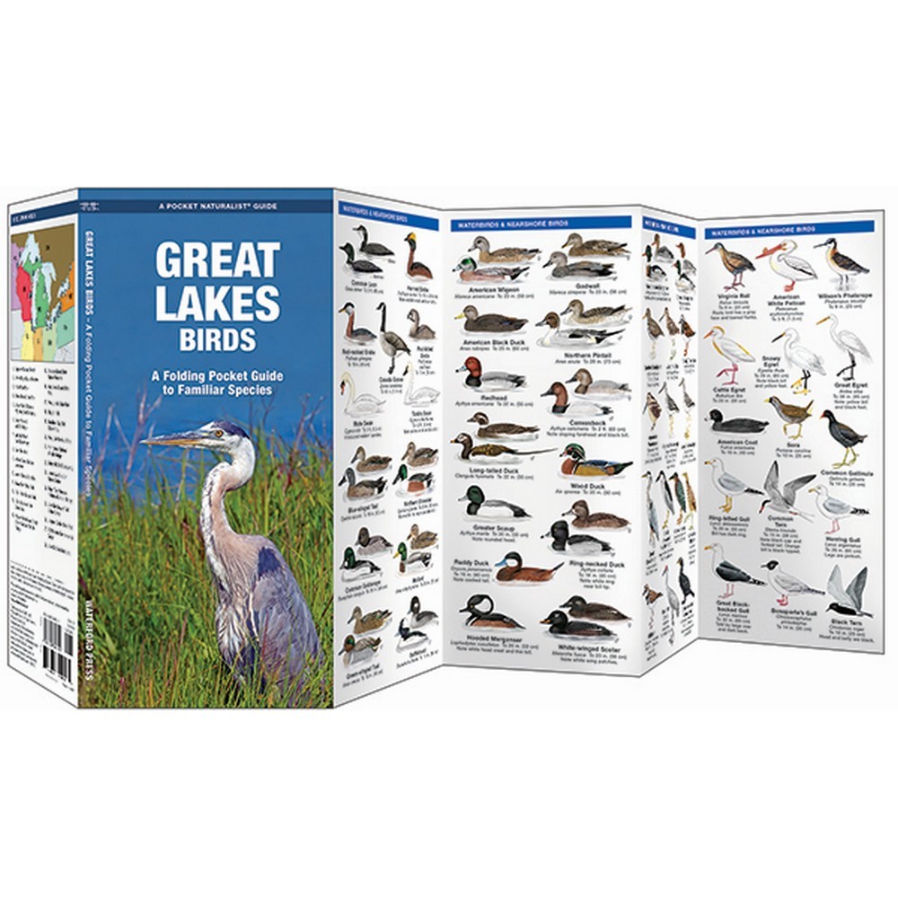 Great Lakes Birds is a pocket-sized, folding Pocket Naturalist guide highlighting the most commonly viewed birds in the Great Lakes region. An inset map of popular birding areas rounds out this portable resource. Laminated for durability, these handy guides are a great source of portable information on the trail or in your backyard.