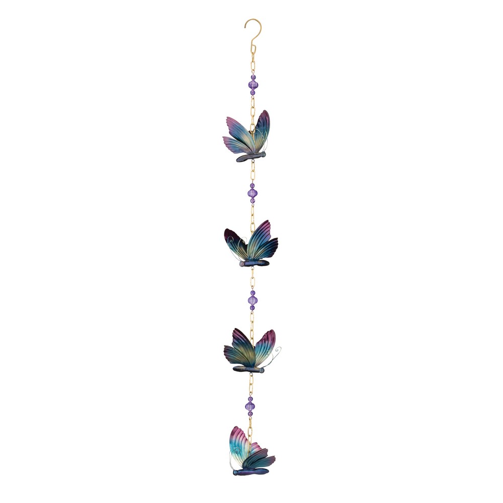 DescriptionReviews Description Hang this fun and colorful ornament from a tree or pergola or even a shepards hook. The metallic colors and beads enhance the style. Crafted from metal glass and acrylic. Slightly over 3 feet in length. Reviews Be the first to review this item There are no reviews yet Product tags Butterfly 842