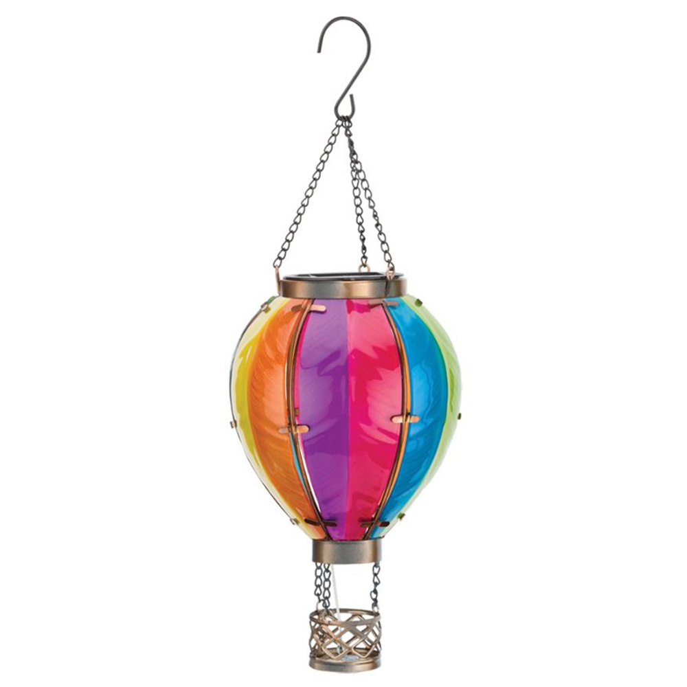 Beautifully hand-painted multi-colored glass work in the most popular hot air balloon colors. Special flickering LED solar lights create the appearance of flames shooting up from the burner engine in a real hot air balloon. A very unique and dramatic effect. Uses solar panel 2V 100mAh using Ni-MH AAA 600mAh 1.2V battery
