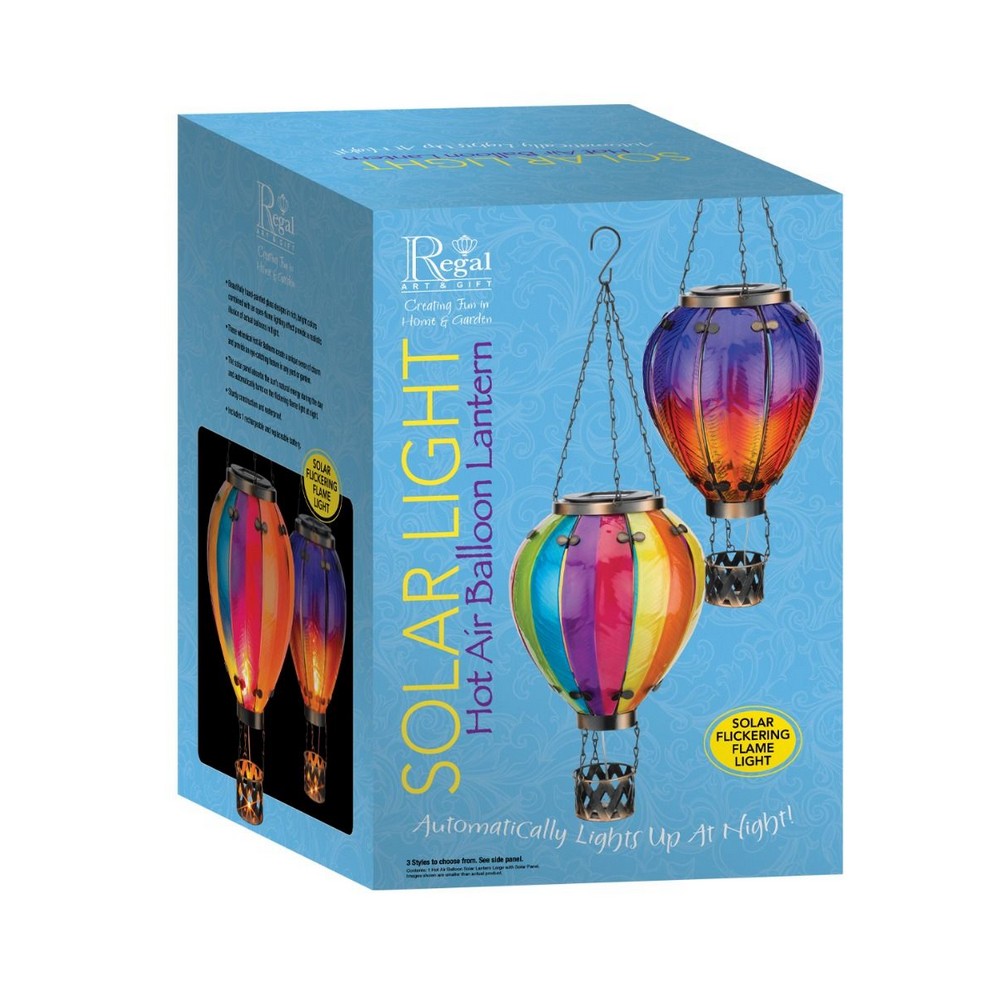 Beautifully hand-painted multi-colored glass work in the most popular hot air balloon colors. Special flickering LED solar lights create the appearance of flames shooting up from the burner engine in a real hot air balloon. A very unique and dramatic effect. Uses solar panel 2V 100mAh using Ni-MH AAA 600mAh 1.2V battery