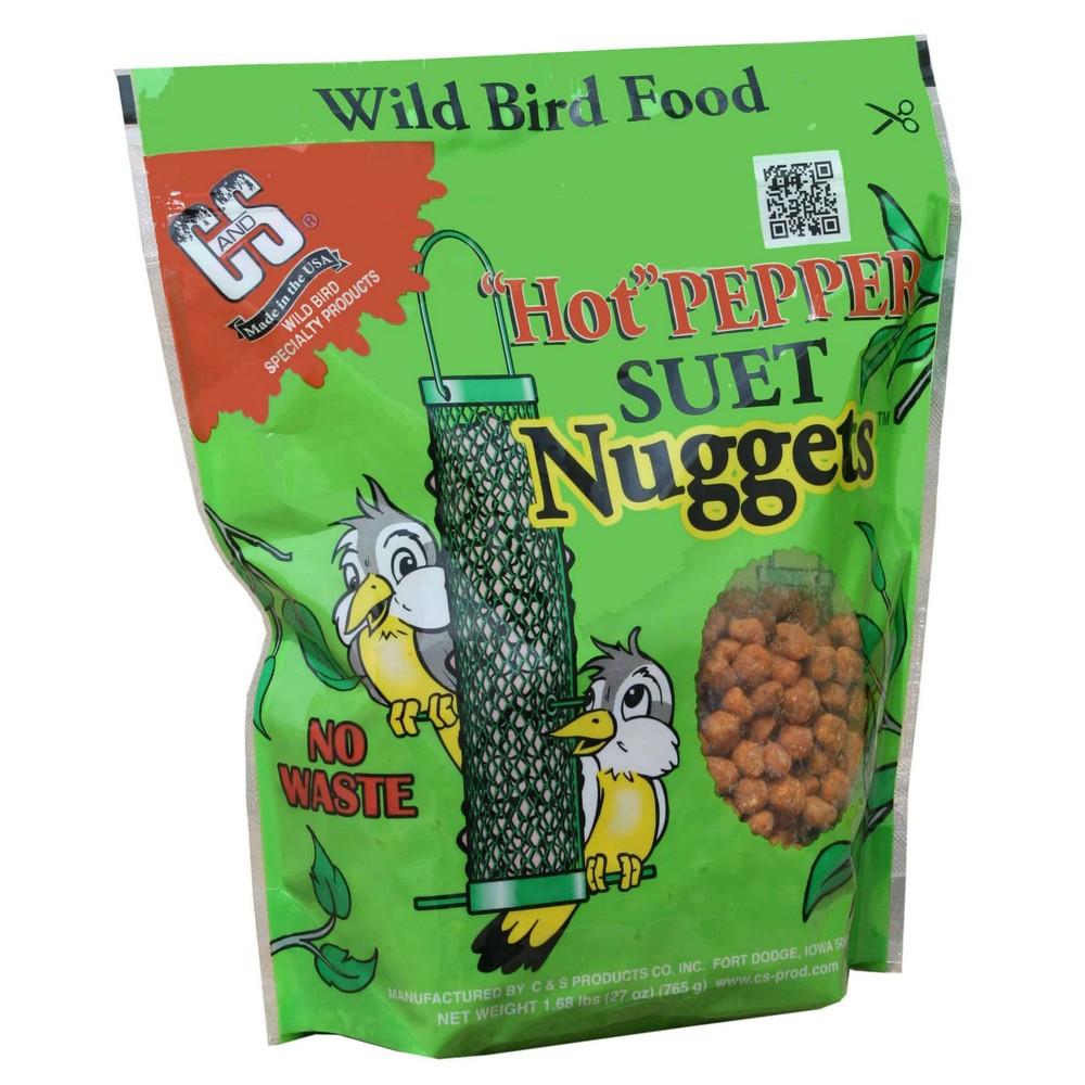 Corn, Roasted Peanuts, Rendered Beef Suet, Oats, Pepper (Red), Soy Oil. Keep the Squirrels away! Hot Pepper Suet Nuggets can be fed alone on a platform feeder or Nugget/Peanut feeder. Ideal when mixed with 5-10 lbs. of seed in a traditional feeder. Resealable bag. (must order in 4's)