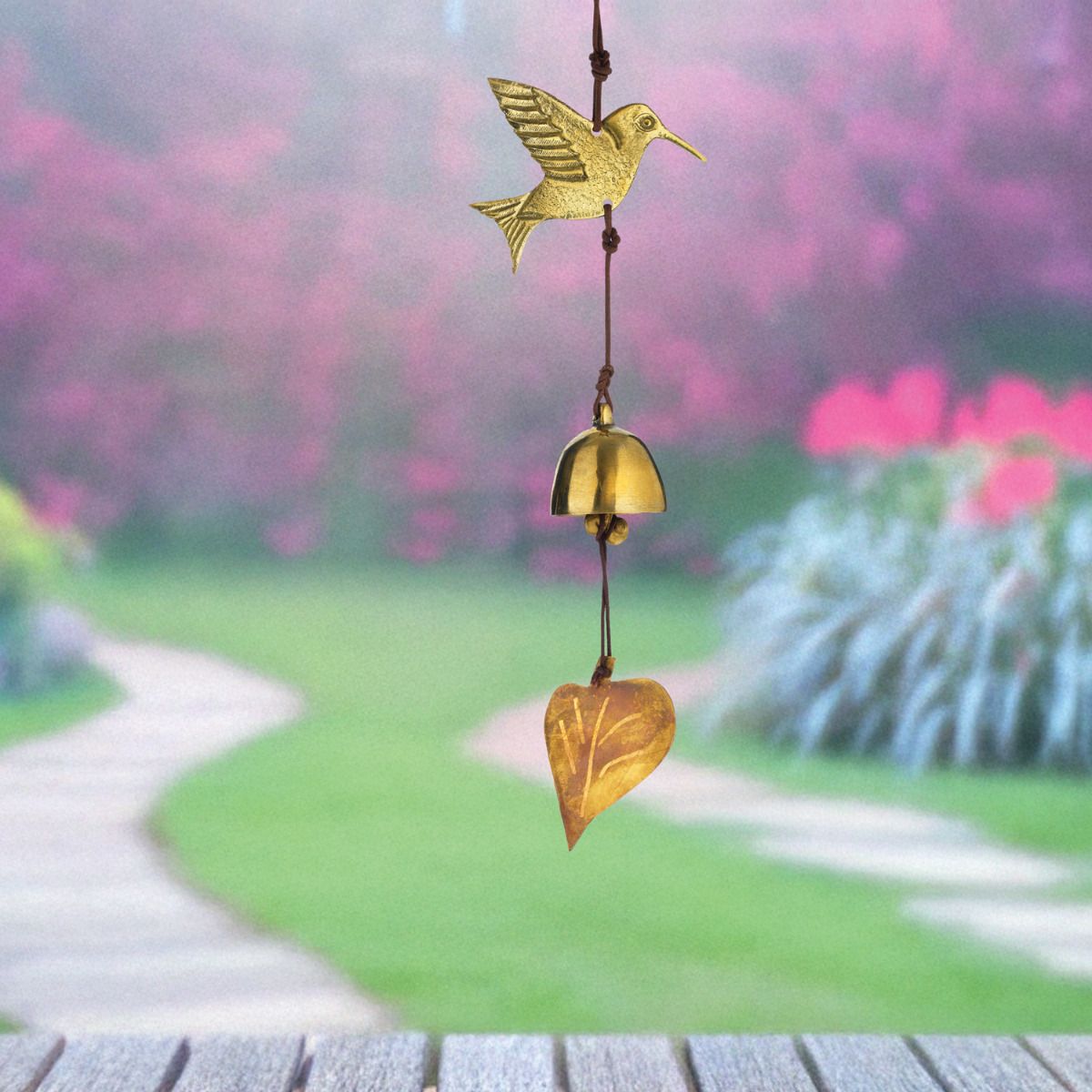This unique and lovely chime makes a wonderful accent to the garden and porch areas. A solid Brass hummingbird perches above one of our hand cast Himalayan bells. A bodhi leaf windcatcher dangles below, a traditional symbol of the infinite wisdom of Buddha nature. Made exclusively for dZi by the Tibetan colony of Lingtsang in northern India, these handsome Tibetan bells and chimes are individually sand-cast in solid Brass and carefully hand-tuned to ensure clarity of sound and tone.