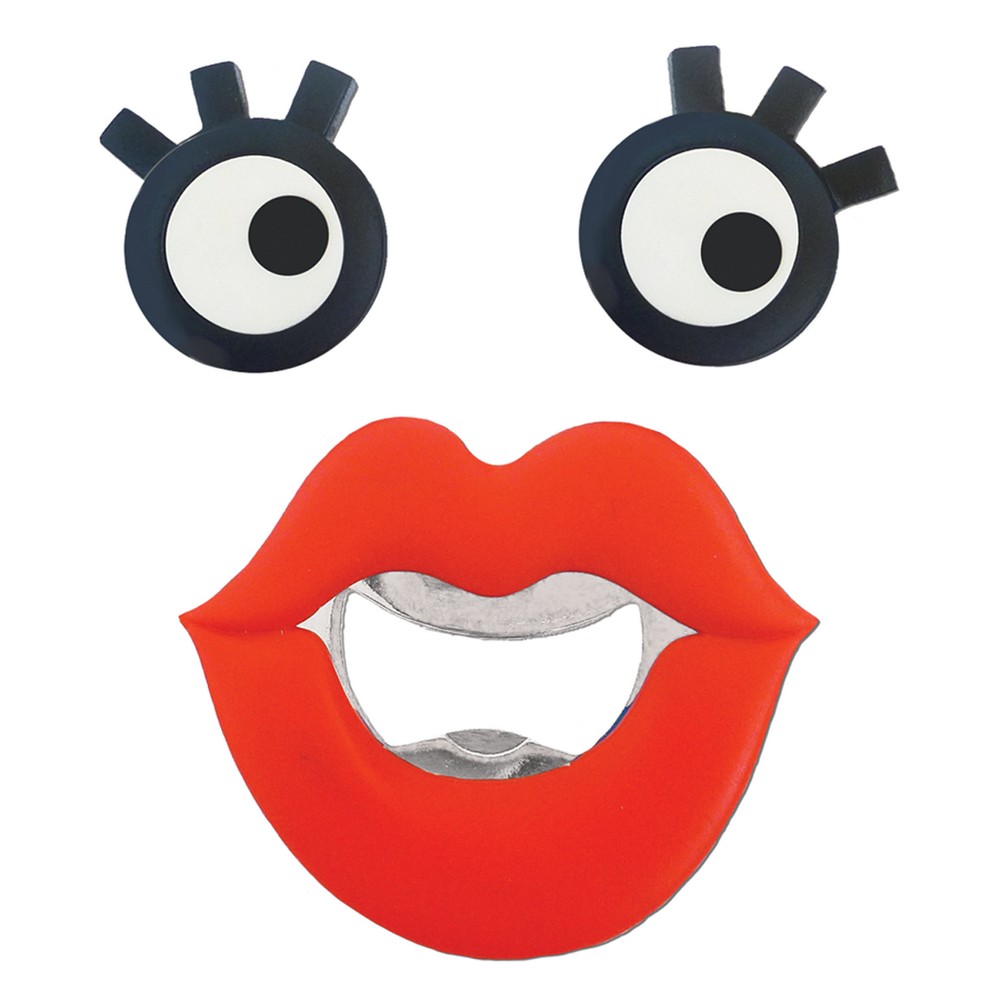 Boring bottle openers are a thing of the past! With Bella Vitas combination eyes and lips bottle opener, popping the top will never get old. This silicon set features a magnetic catch and will stick right to your fridge for easy accessibility. Pop, Pucker, and sip!