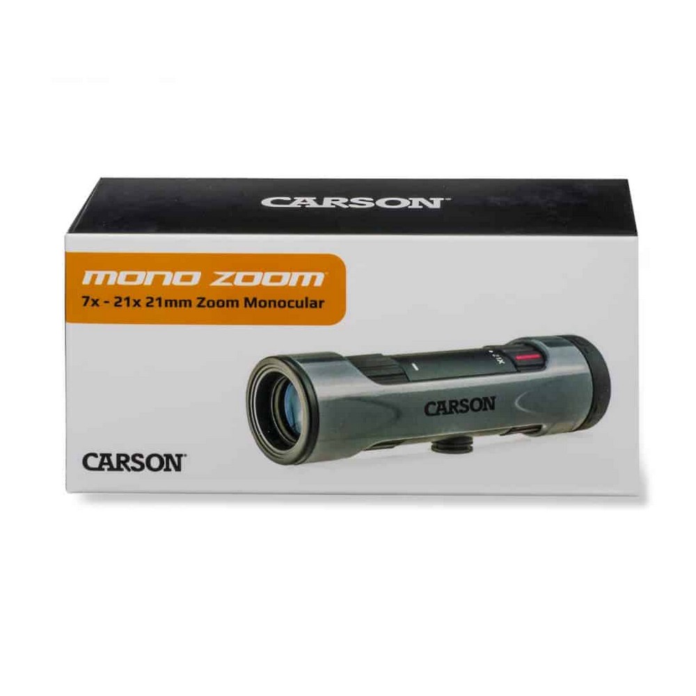 The MonoZoom from Carson is a 7-21x21mm compact, portable and lightweight monocular that is perfect for traveling and exploration. This monocular contains a zoom feature that offers a wide 7x-21x power magnification range. The fully coated optics and BAK-4 prisms allow for bright, sharp and crystal clear image quality. With its sturdy and durable outer housing shell, this zoom monocular is ideal for bird watching, hiking, sight-seeing, sporting events, hunting, concerts and many other outdoor activities. This monocular contains an extremely smooth focusing knob and is also tripod compatible. The MonoZoom monocular comes included with a soft pouch, neck strap and a lens cover to help protect it from dust, debris and from scratching. It is backed by Carson's No Fault, No Hassle Warranty.