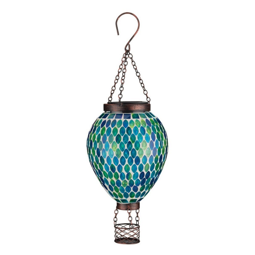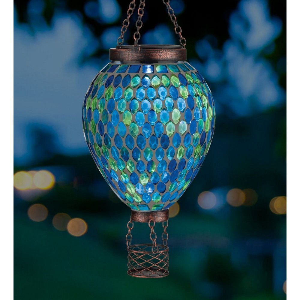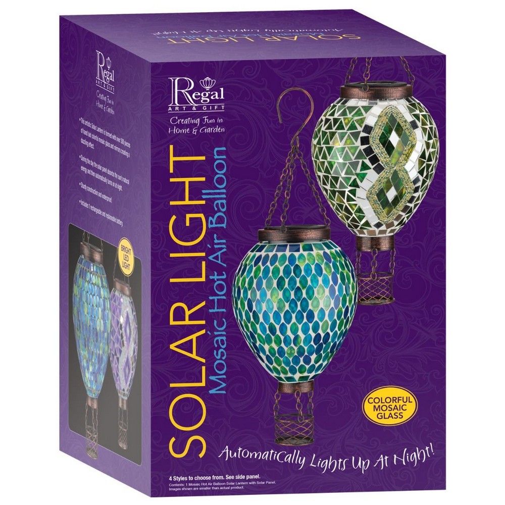 These artistic Solar Lanterns are formed with over 300 pieces of hand laid colorful mosaic glass and mirrors creating a dazzling effect. During the day these balloons glisten in the sun and at night will light up from the solar powered LED light inside. Available in 4 styles/color: Blue, Multi, Green and Purple. Over 300 individually placed glass pieces. Hot Air Balloon Solar Lanterns comes with a chain and hook for easy hanging. 6-8 hours of continuous light at night, with replaceable batteries and waterproof solar panels. Weather & fade resistant paint