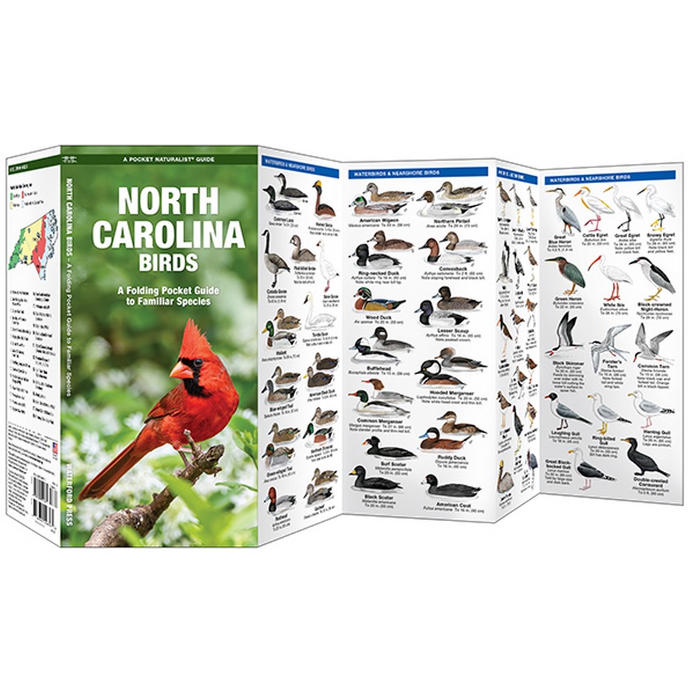 The Tarheel State is the permanent or migratory home of 473 species of birds, including the state bird – the northern cardinal. This beautifully illustrated guide highlights over 140 familiar and unique species and includes an ecoregion map featuring prominent bird-viewing areas. Laminated for durability, this lightweight, pocket-sized folding guide is an excellent source of portable information and ideal for field use by visitors and residents alike. Made in the USA.