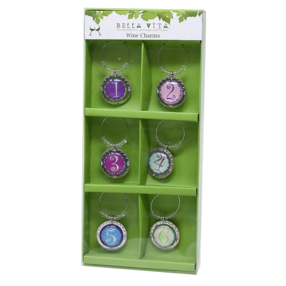 DescriptionReviews Description Keep track of your stemware with this set of six decorative metal wine charms. Wine charms are a fun hostess gift and great for entertaining. Numbers charms in six unique colors, each on a beaded ring. Reviews Be the first to review this item There are no reviews yet Product tags Wine 3591