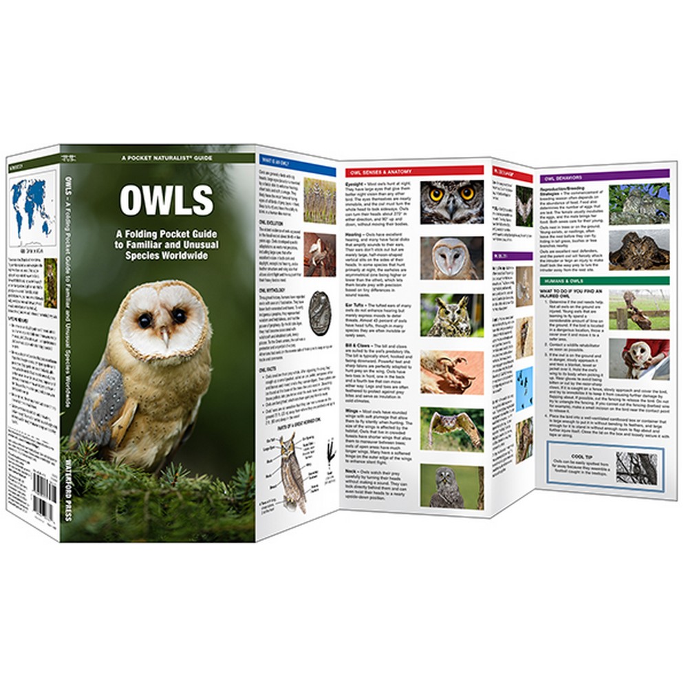 Owls first appeared in the fossil record about 56–65 million years ago and now live almost everywhere in the world where there is land, except Antarctica (one sighting of a single bird) and a few remote islands. Exceptional hunters, owls have superb eyesight and keen hearing, and are important to maintaining a healthy ecosystem. This 12-panel folding guide introduces you to the world of owls; describes their evolution, anatomy and behavior; and explains how they reproduce and survive in different habitats around the world. It also highlights some of the most familiar and unique species found worldwide, as well as threats to owls' survival and what you can do to help conserve and protect these species. Perfect for citizen science programs. Made in the USA.