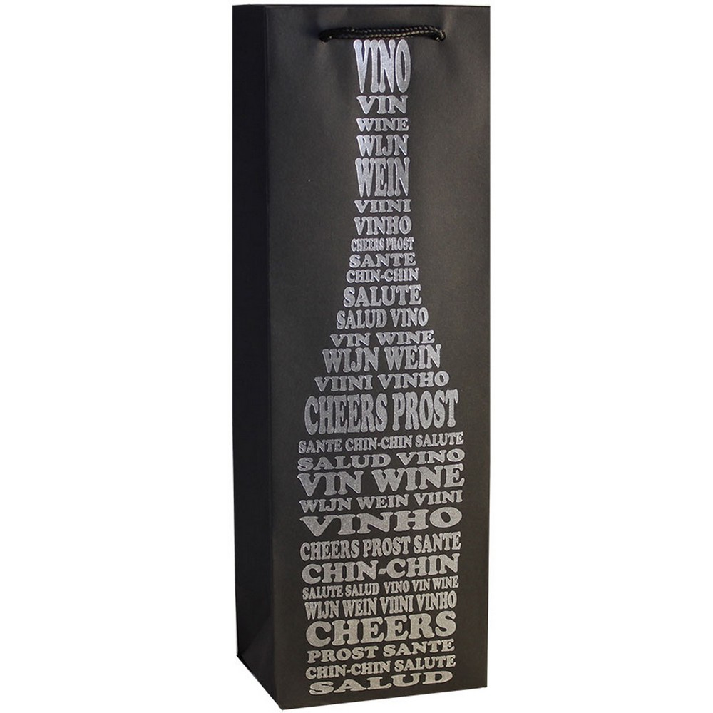 In how many languages can you say wine and toast? Well with Bella Vitas Cheers wine bottle bag you won't have to rack your brain too hard to impress. This Black foiled wine bag just so happens to feature a motif created out of words for ""wine"" and ""toast"" in different languages. Made from sturdy Kraft paper, this gift packaging worldly and a great conversation starter!
