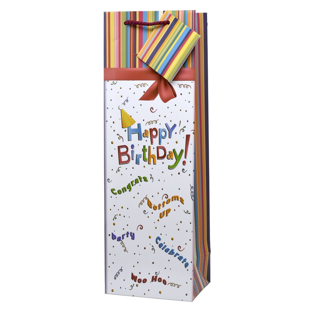 Send some Happy Birthday wishes with Bella Vita's single bottle wine bag. Crafted from superior quality printed paper, this bottle tote is great for gifting wine, champagne, and your favorite spirits. The multicolored design is festive, and delivers a Happy Birthday Message. Let's get this party started!