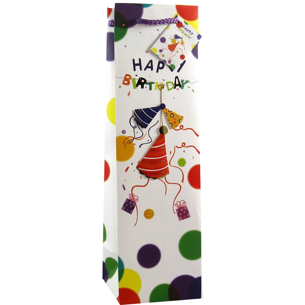 Put your party pants and hats on! Bella Vitas 3D party hat premium decorative paper wine bag delivers the celebration. This bottle carrier features multidimensional party hats and proclaims a cheerful Happy Birthday message. It comes included with a matching gift tag for your personalized message, and delivers the party in a wine gift bag!