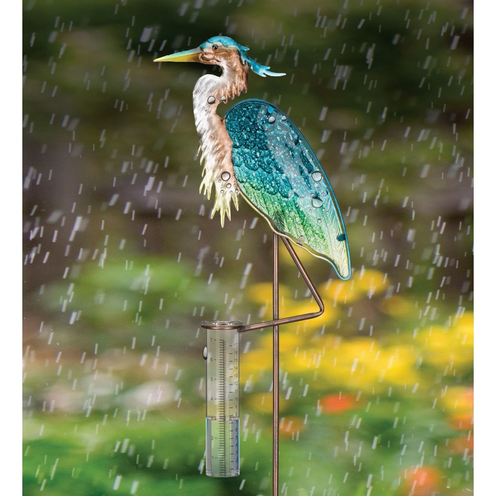 Features a metal head and neck painted with iridescent accents as well as a hand-painted glass body embossed with feathered wing detail. Gauge comes with a large, easy to read glass tube that has measurements in both inches and millimeters. Comes with a two-prong fork to secure it to the ground