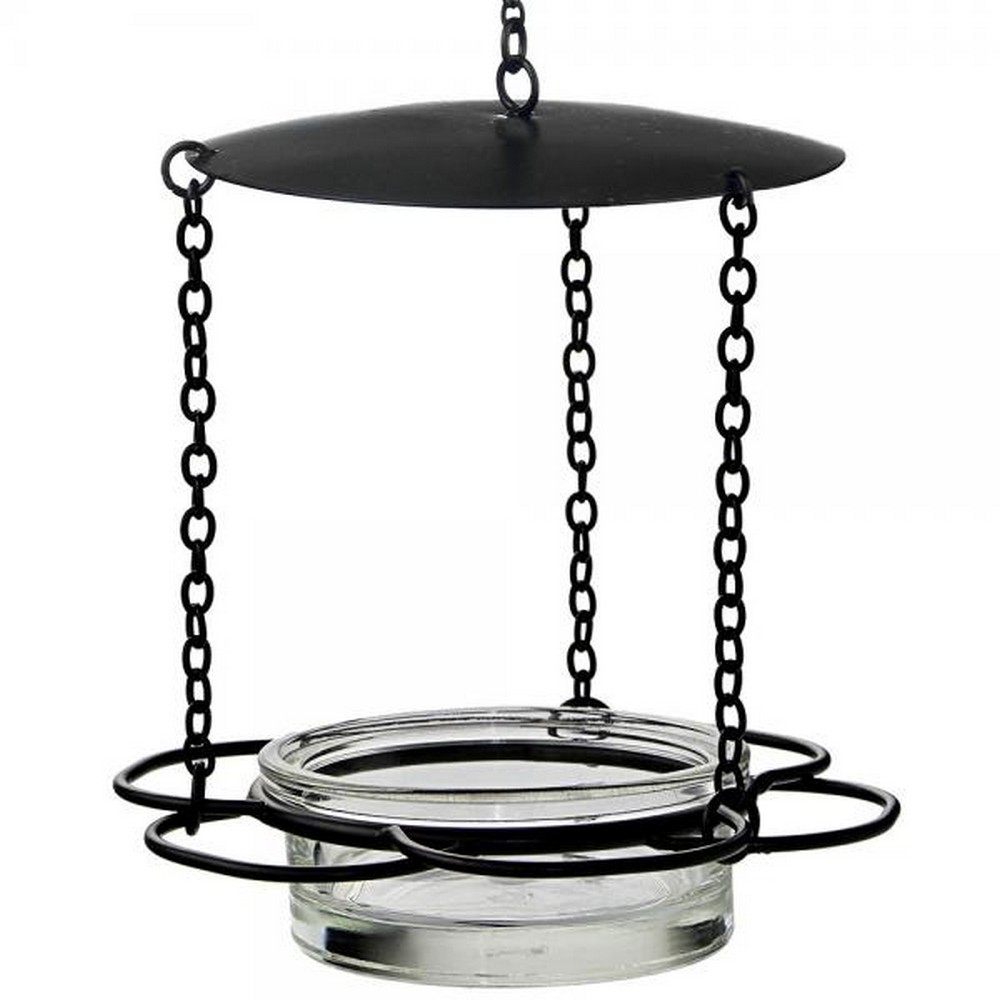 3.4 Ounce Capacity accommodates several birds at once. Open Top hook With Metal Chain allows for easy hanging. Petal-Shaped Wire Perch provides resting spot for birds and longer viewing enjoyment. Detached Glass Bowl supports quick and easy hand cleaning. Recycled Glass & Powder Coated Metal Construction makes for an eco-friendly and longer lasting feeder.