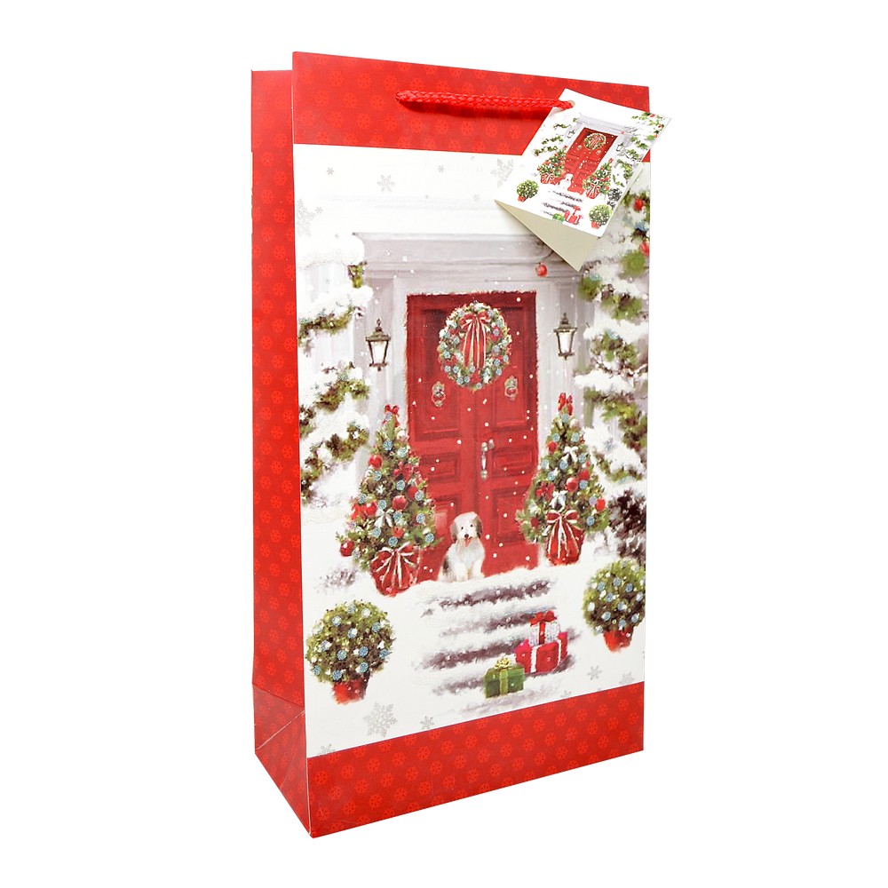 Get into the spirit of the holiday! Bella Vita's double bottle wine bag is printed with festive home for the holidays scene - doggie and frosty included with glitter accents . Fun and festive, your bottle of wine will be extra well received! Bella Vita's printed paper bags are made of thick durable paper with support at the base and collar to protect your gift of wine.