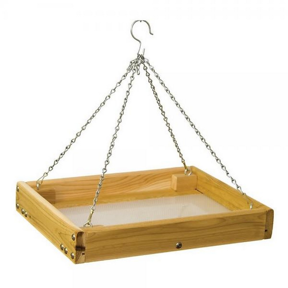 Small Hanging Tray Feeder with Perforated Plastic Floor. Includes chain and hook. Durable, long lasting construction. Sturdy and easy to use. Perforated tray allows water to drain out.