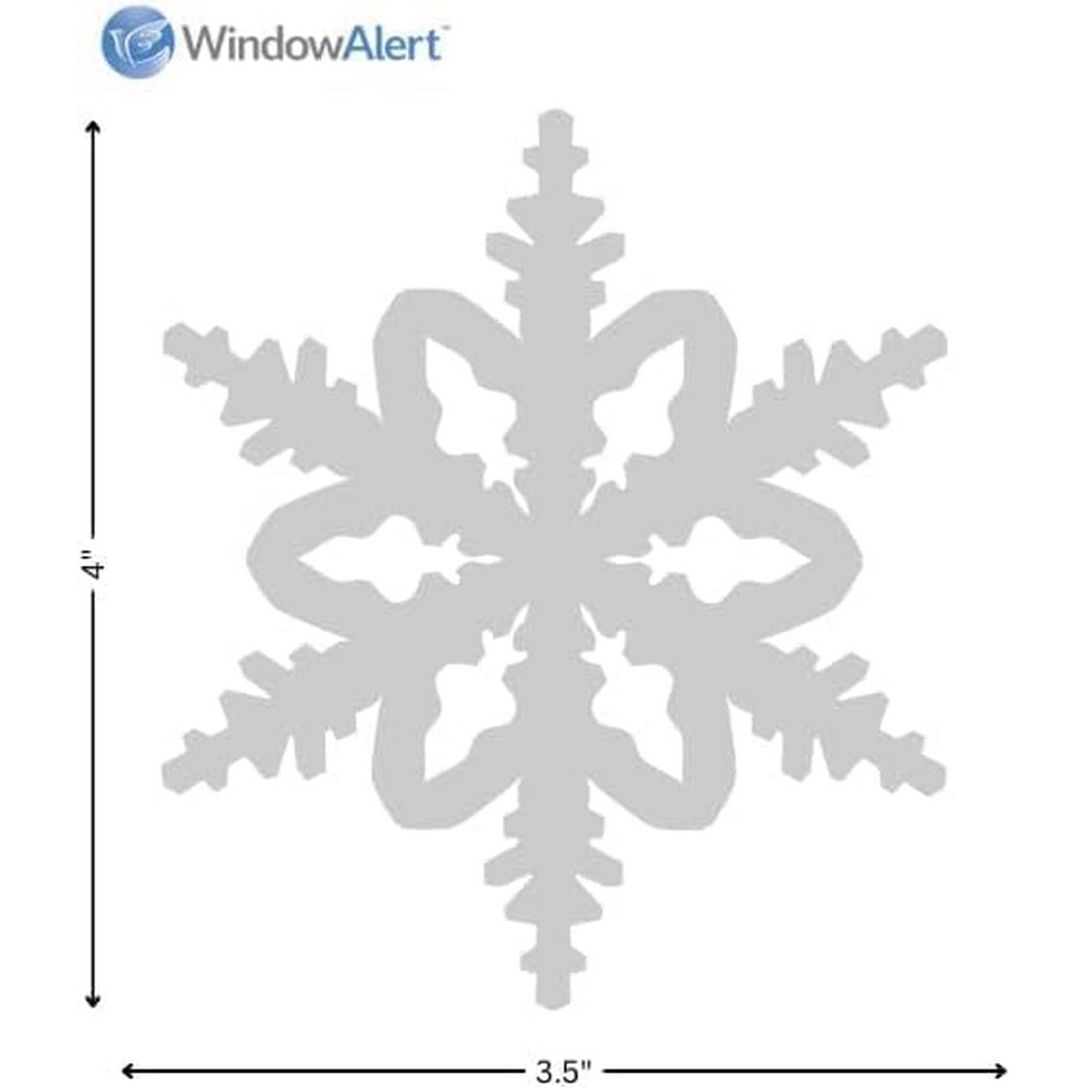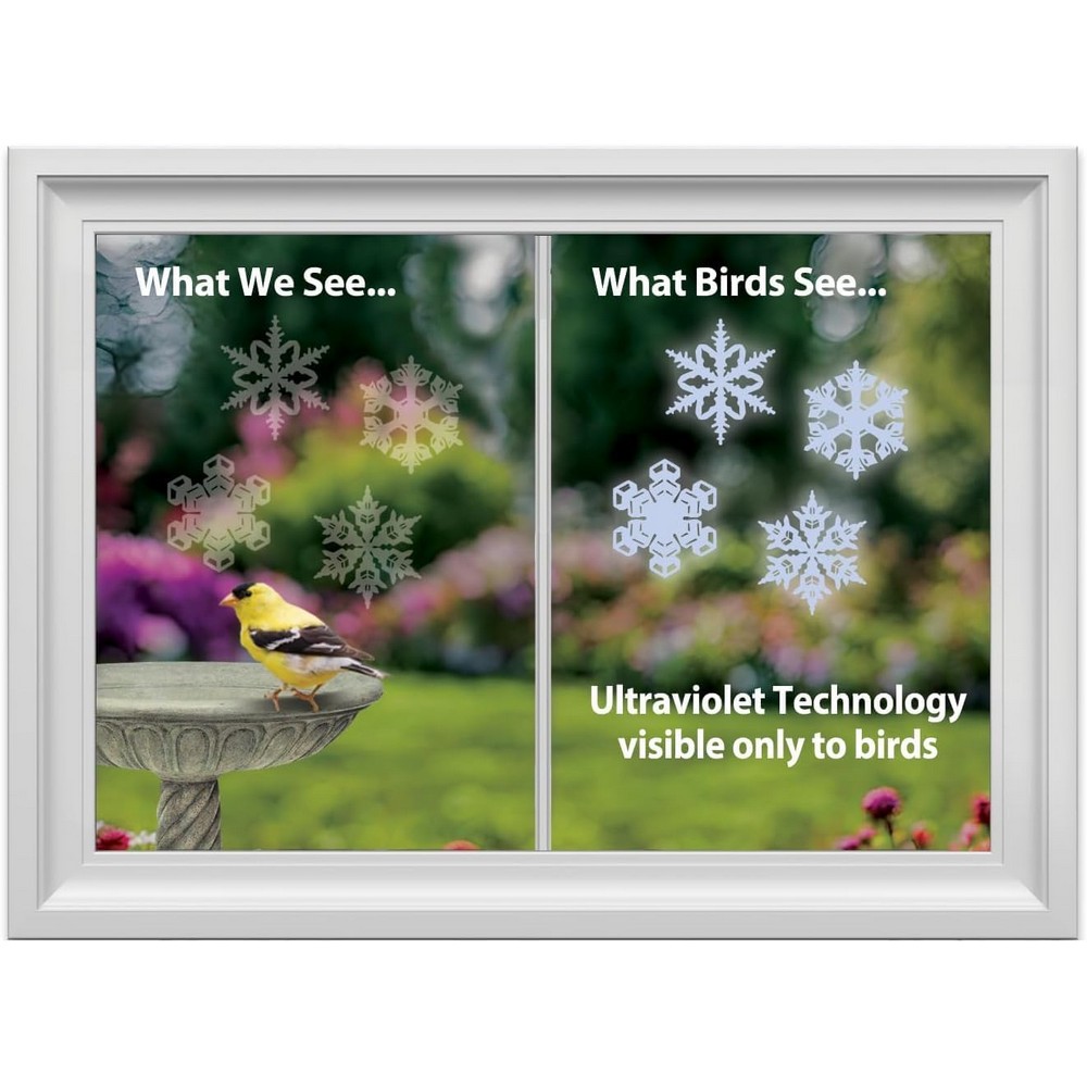 4 different snowflake designs. Protect wild birds from windows. Millions of wild birds are killed each year flying into windows. Now you can help reduce this loss of life. Window Alert is a static-cling decal that may be applied to home and office windows. The decal contains a component which brilliantly reflects ultraviolet sunlight. This ultraviolet light is invisible to humans, but glows like a stoplight for birds. Birds have vision that is up to 12 times better than that of humans. Window Alert decals help birds see windows and thus avoid striking the glass. (4 per package). Window Alert decals may be used only on an exterior glass surface free of any overlay, tinting, film, or coating. Clean glass first with water. Avoid use of chemicals such as ammonia or window cleaners. Decals are best applied when glass is warm (ideally greater than 50 degrees). If applied during winter months, clean glass with warm water prior to application. Place decals alone or in groups every few feet on the outside of the window. Position out of reach of infants and small children. Restore static cling by rinsing in lukewarm water. UV coating may fade based on exposure and local elevation. Replace decals every 9 to 12 months.