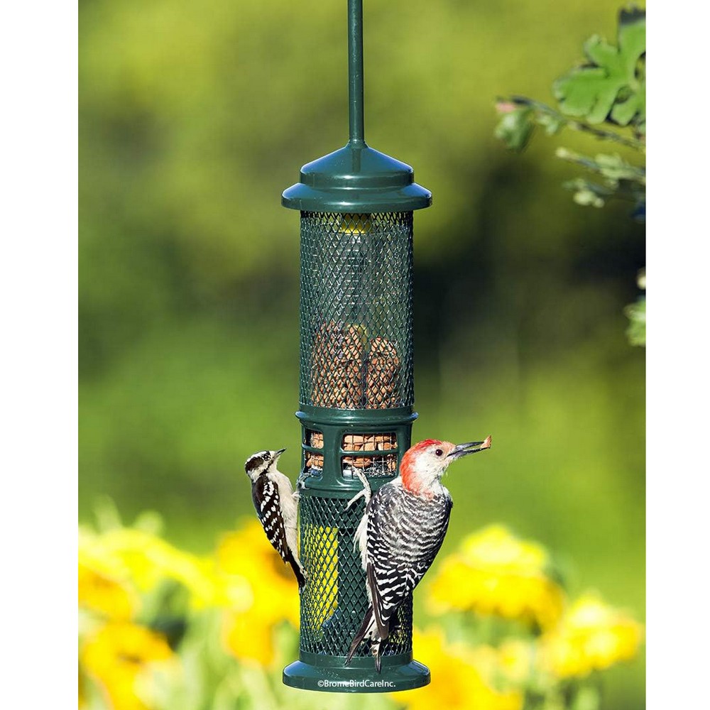 Truly squirrel proof! Effective against Red and Gray Squirrels, and some large nuisance birds. Woodpecker friendly tail prop. The Squirrel Buster Peanut + feeder is designed with a large tail prop allowing woodpeckers to feed comfortably, using their tails for support and balance just like they do on trees. Mess free. The wire mesh holding the shelled peanuts or wild bird food nuggets is calibrated so that birds cannot simply sweep the food out of the feeder. Very small bits that may fall below the feeder will be eaten by ground feeding birds or squirrels. Food is not wasted and there is no mess to clean up. Ideal for decks, condos and apartments. Attracts birds. Peanuts are an incredibly popular food at feeders and will attract a great variety of birds. Nuggets, a high energy suet-based soft wild bird food product, are a favorite of all suet, fruit and insect-eating birds. Both are high in protein, oil, and fat, making them a perfect addition to the foods you offer the birds in your backyard. Also attracts: Grosbeaks, Blue Jays, Pine Siskins, Redpolls, Sparrows, Tufted Titmice, Woodpeckers, and Wrens. Comes with Lifetime Care.