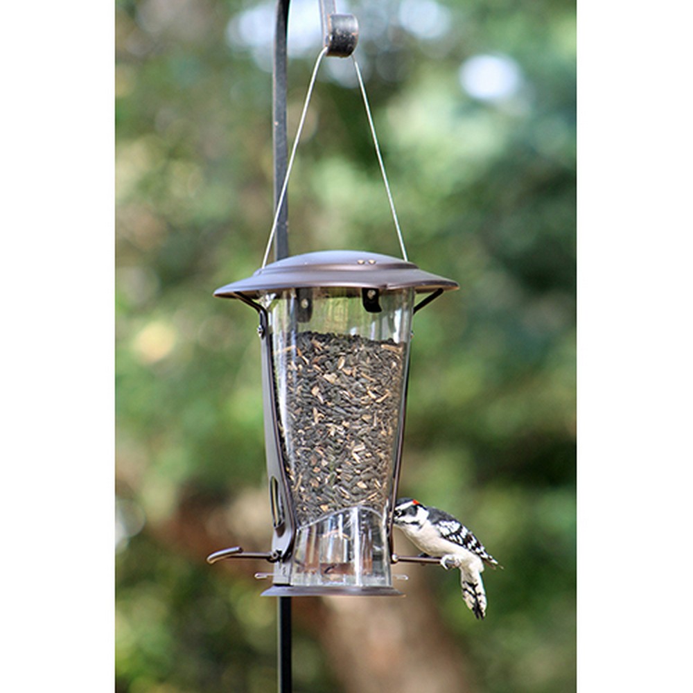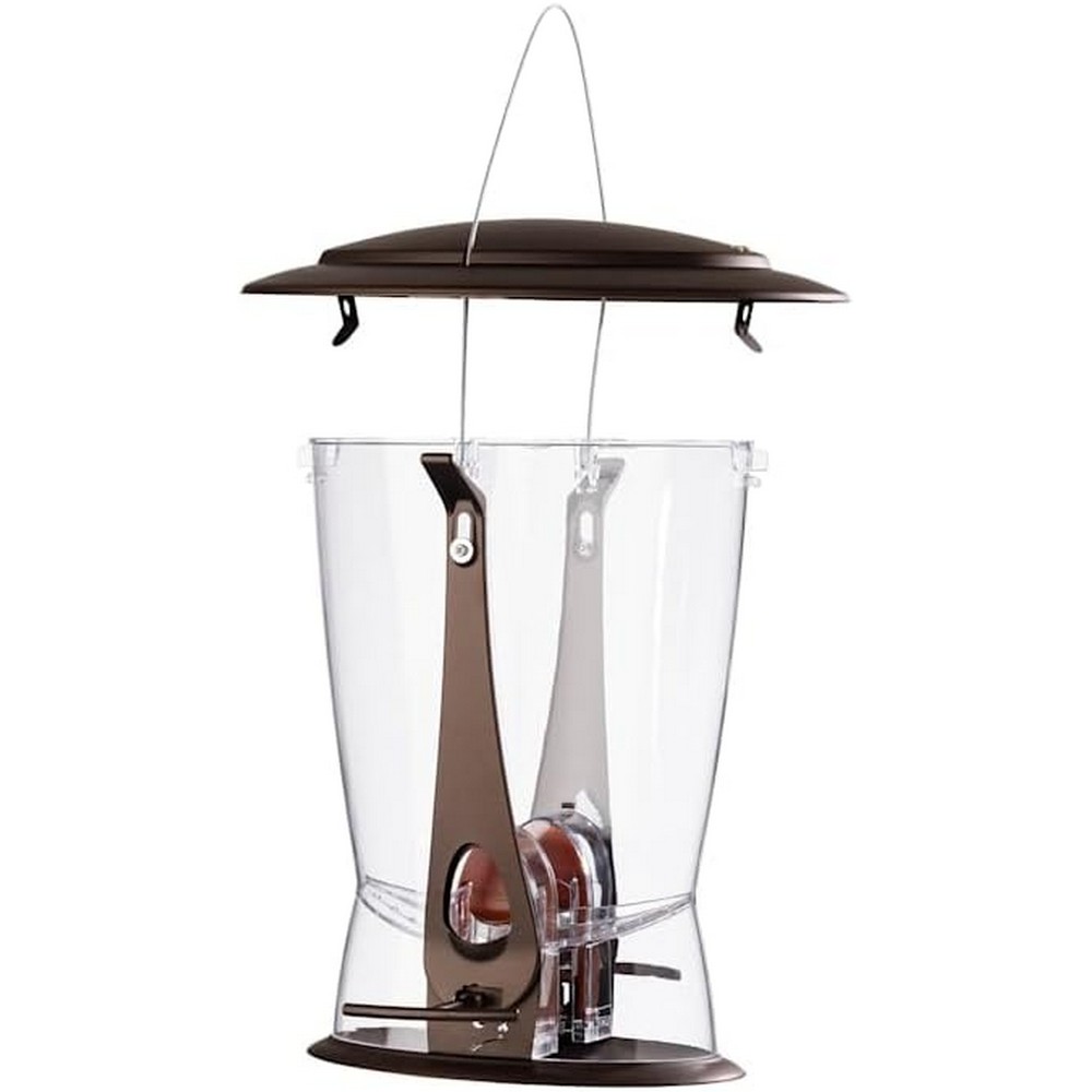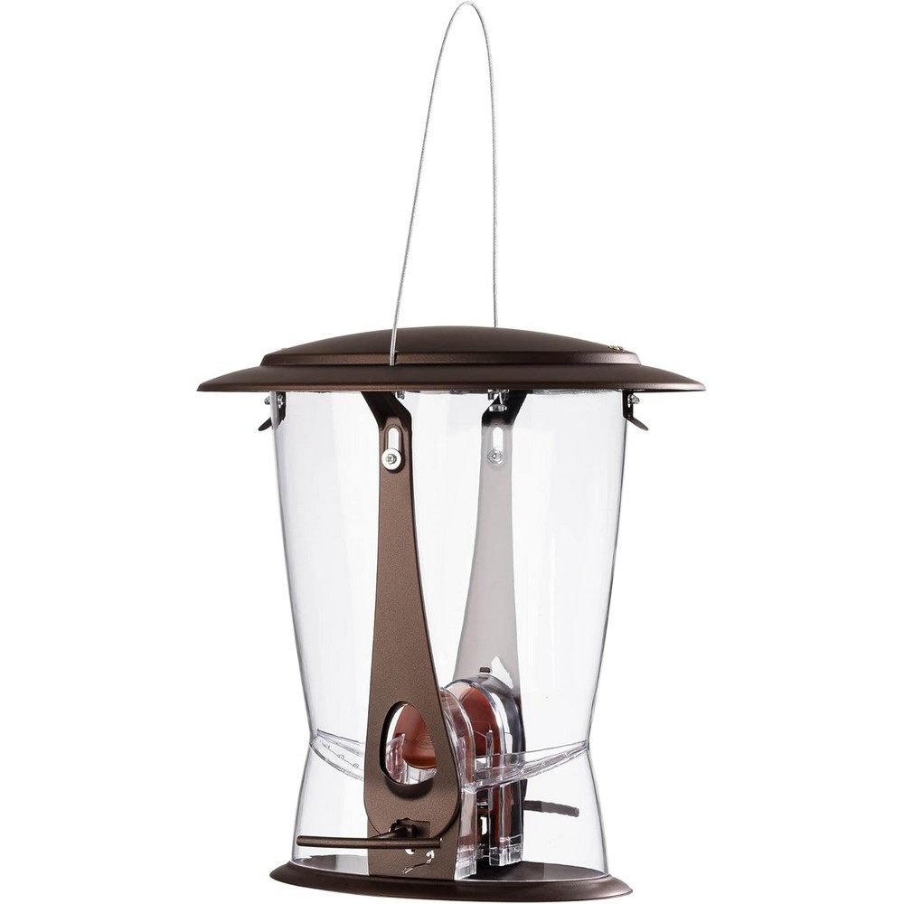 Squirrel proof feeder in attractive brushed copper finish, wide mouth for easy filling. 2 feeding ports. The stylish tapered design with locking metal roof has a functional roof that tilts to close both ports when stepped on by a squirrel and the 2 integrated metal perches are spring loaded to close both ports with pressure from a squirrel. Base is removable for easy cleaning. Seed is allocated evenly to both ports. Holds 3.9 pounds of seed, 10.71 inch diameter by 11.4 inch height.
