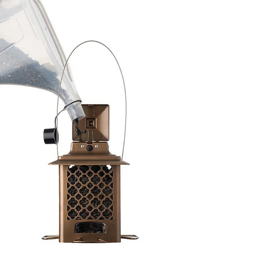 DescriptionReviews Description Part of our SureFill No Spill family- an innovative way to make bird feeding easy! The metal hopper has a one Touch opening for easy filling, 4 ports with large rounded ports to attract more birds and a 3.6 lbs. Capacity. Reviews Be the first to review this item There are no reviews yet