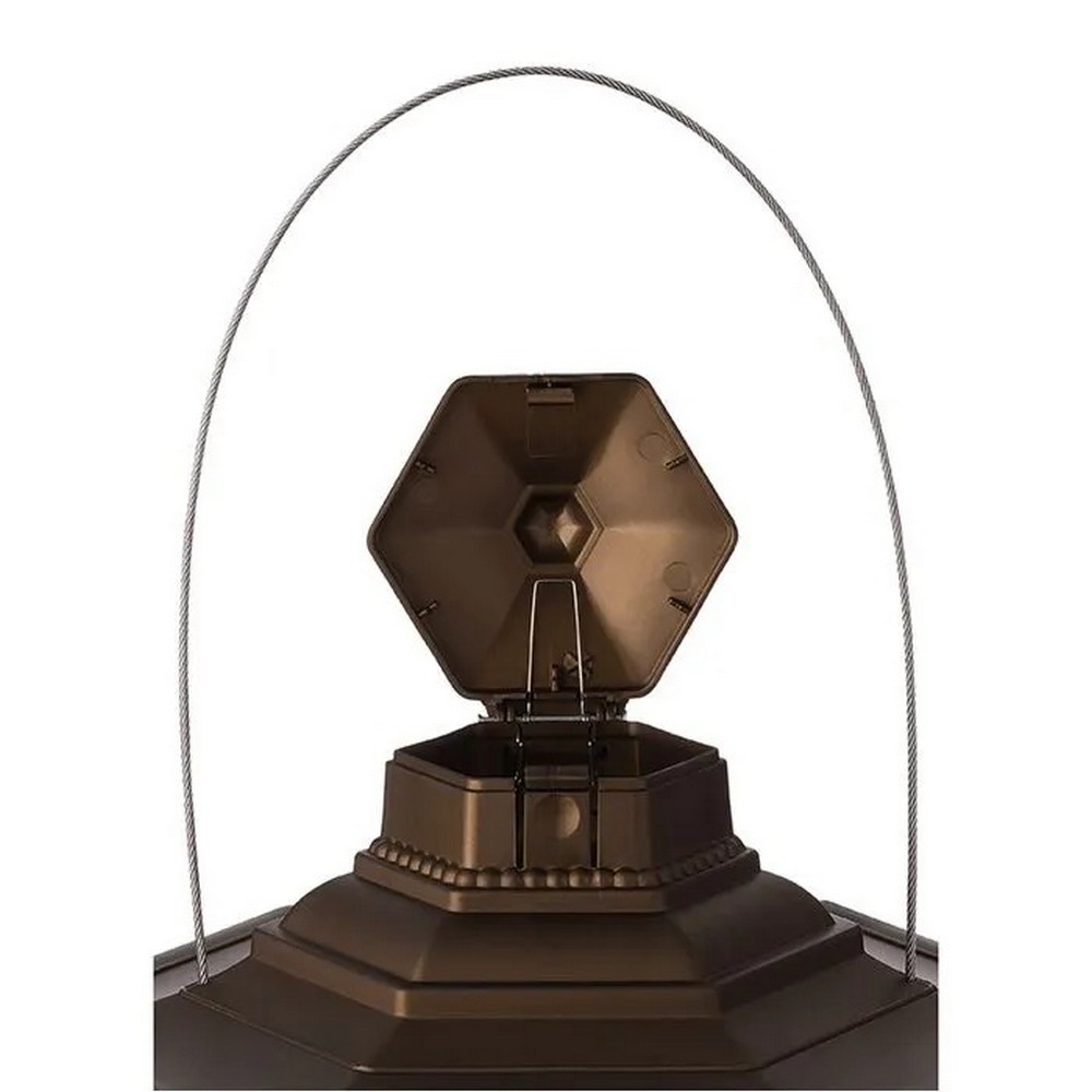 The small plastic lantern feeder features a Pop top for easy filling. Traditional six sided lantern with beautiful frosted plastic sides and bayonet lock for basin for easy cleaning. Features an integral Perch in basin with drainage holes and a pole mounting option that will mount to 1"" wide poles. Holds 2.6 lbs. of seed.