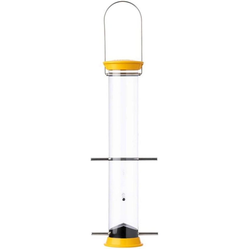 Yellow Metal Thistle Feeder. 15 in. Zinc die cast tops, bases and ports- to last a lifetime Stainless steel wire- squirrels can't chew Snug fitting sliding cap- easy for you to lift but hard for squirrels Top assembly- easily removed for cleaning Contoured base- keeps seed within reach.
